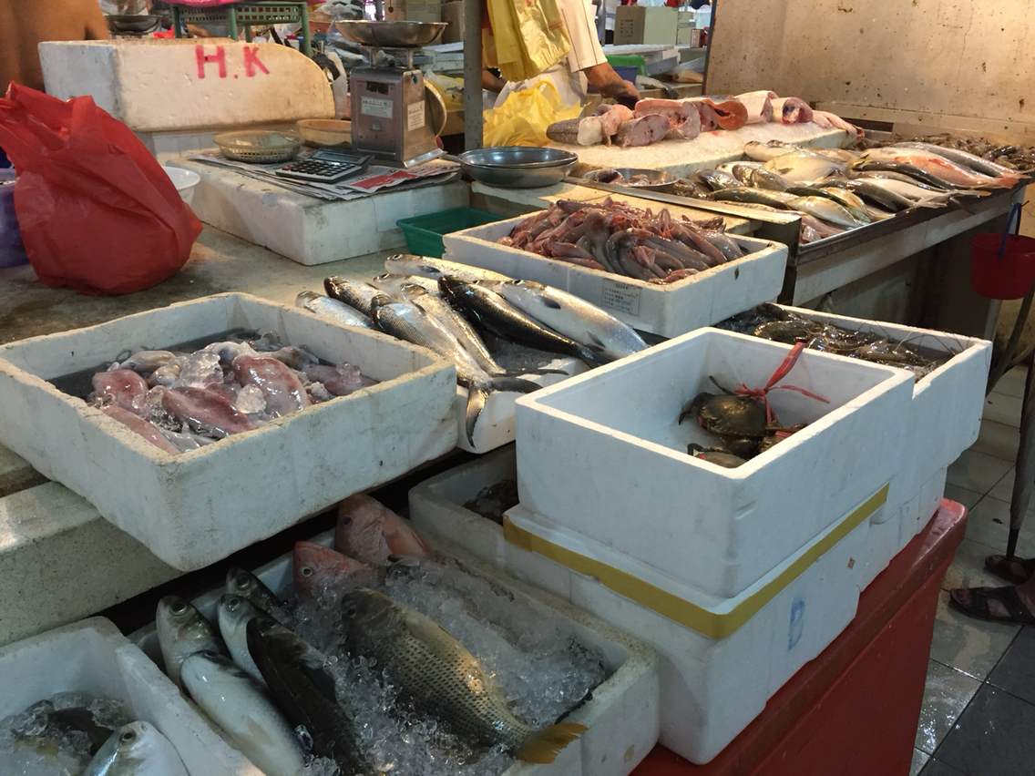 東南アジアの市場ていうと、冷やしてもなくてハエがいて…みたいなイメージでしたが(実際バンコクはそうでした)、ちゃんと氷あるしめっちゃ綺麗!