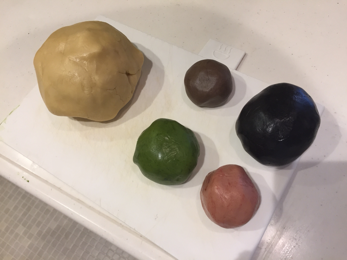 プレーン生地を作ってから必要量取り分けてそれぞれ色付けてます。