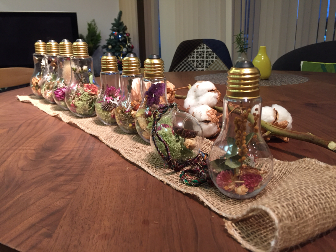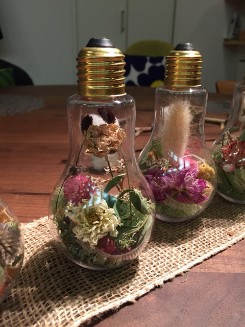電球型か丸い吊り下げ型の容器どちらか選んで、中にドライフラワーを切って入れていきます。それだけ。