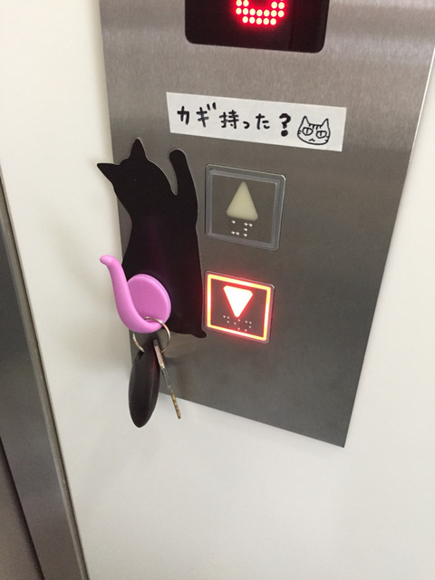 さらにUR氏が東急ハンズでこんなのを買って来て、エレベーターボタンの横に鍵を置くことになりました。