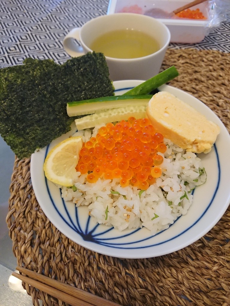 次の日の朝ごはんに、余ってた具材と一緒にいくら丼にしました。
