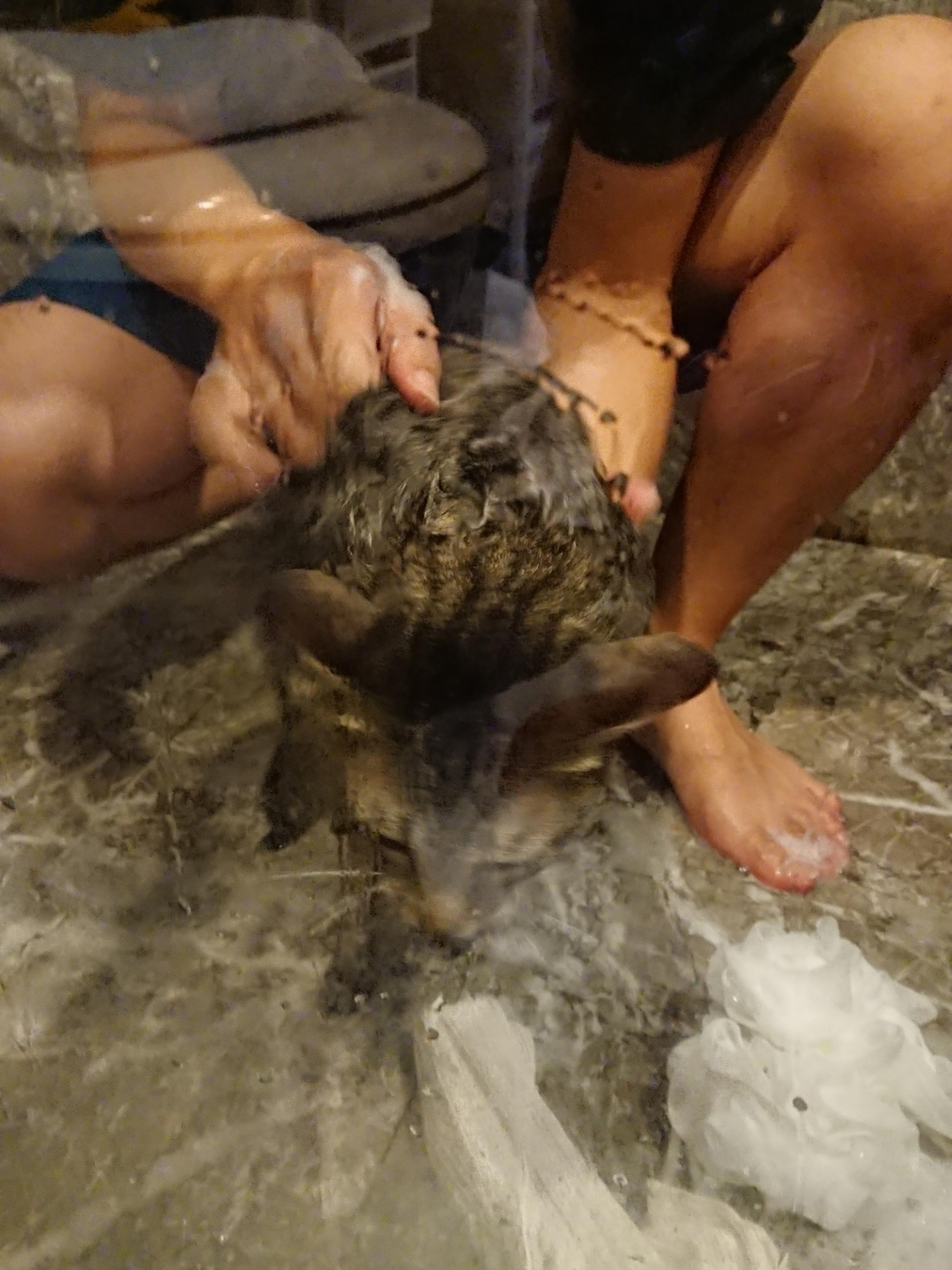 前回は初めてのシャンプーで結構暴れたけど、今回はどうかな?