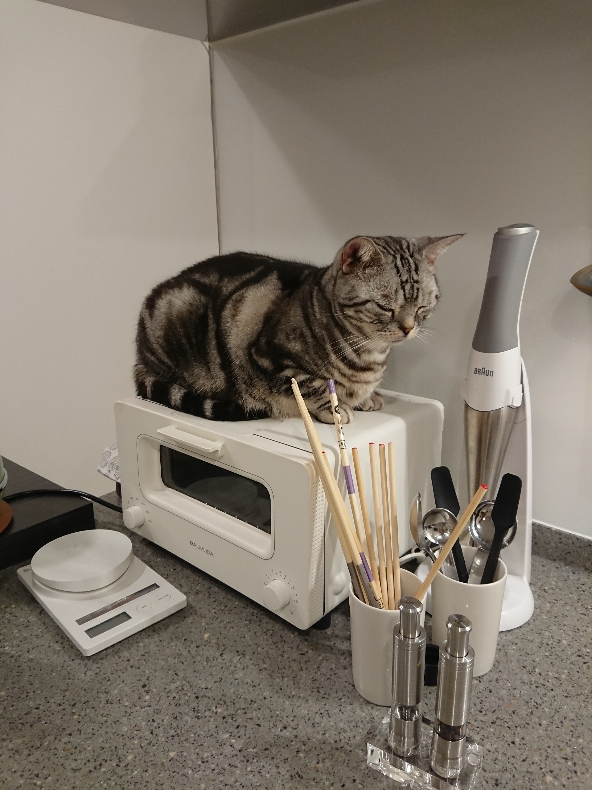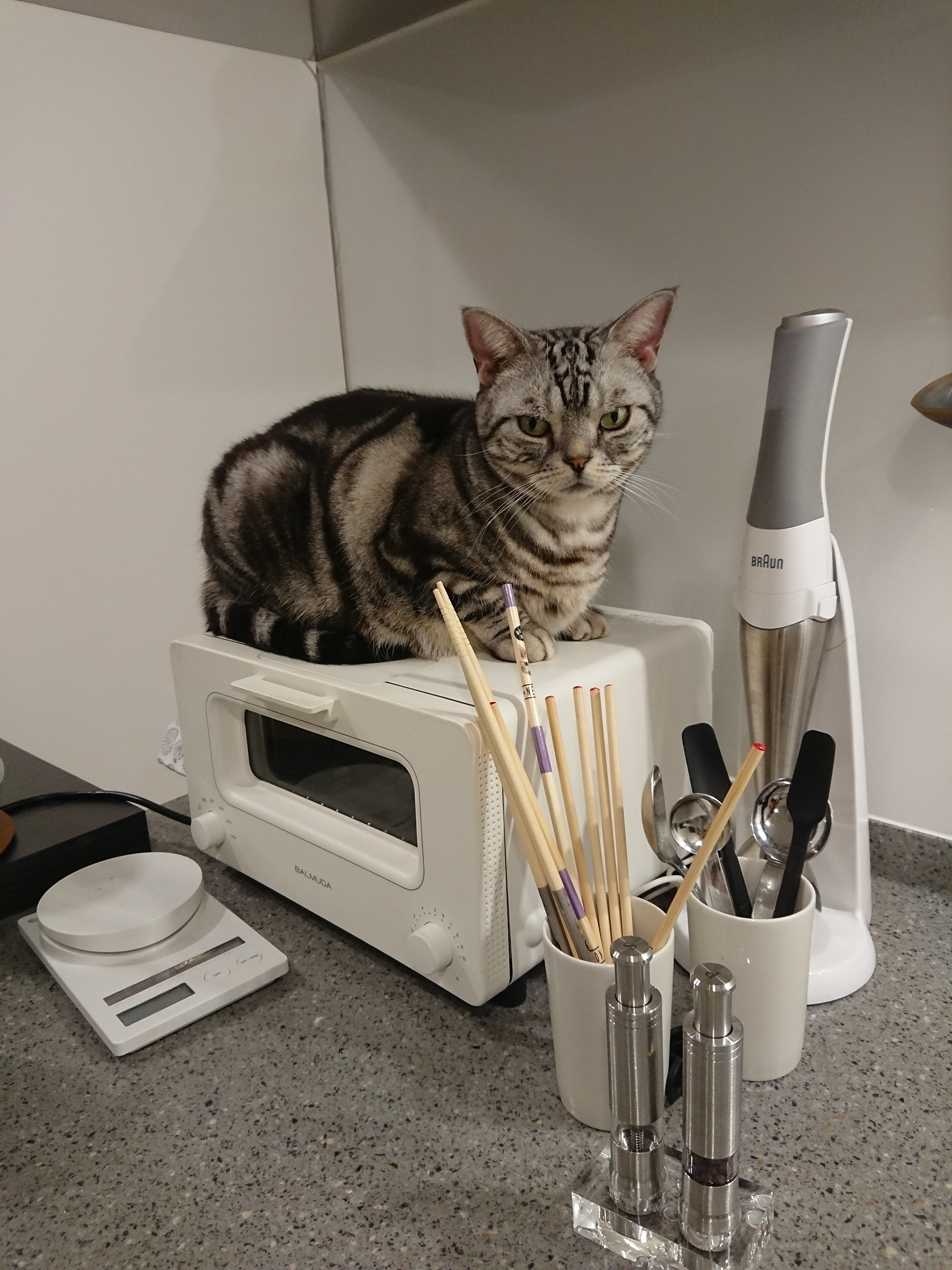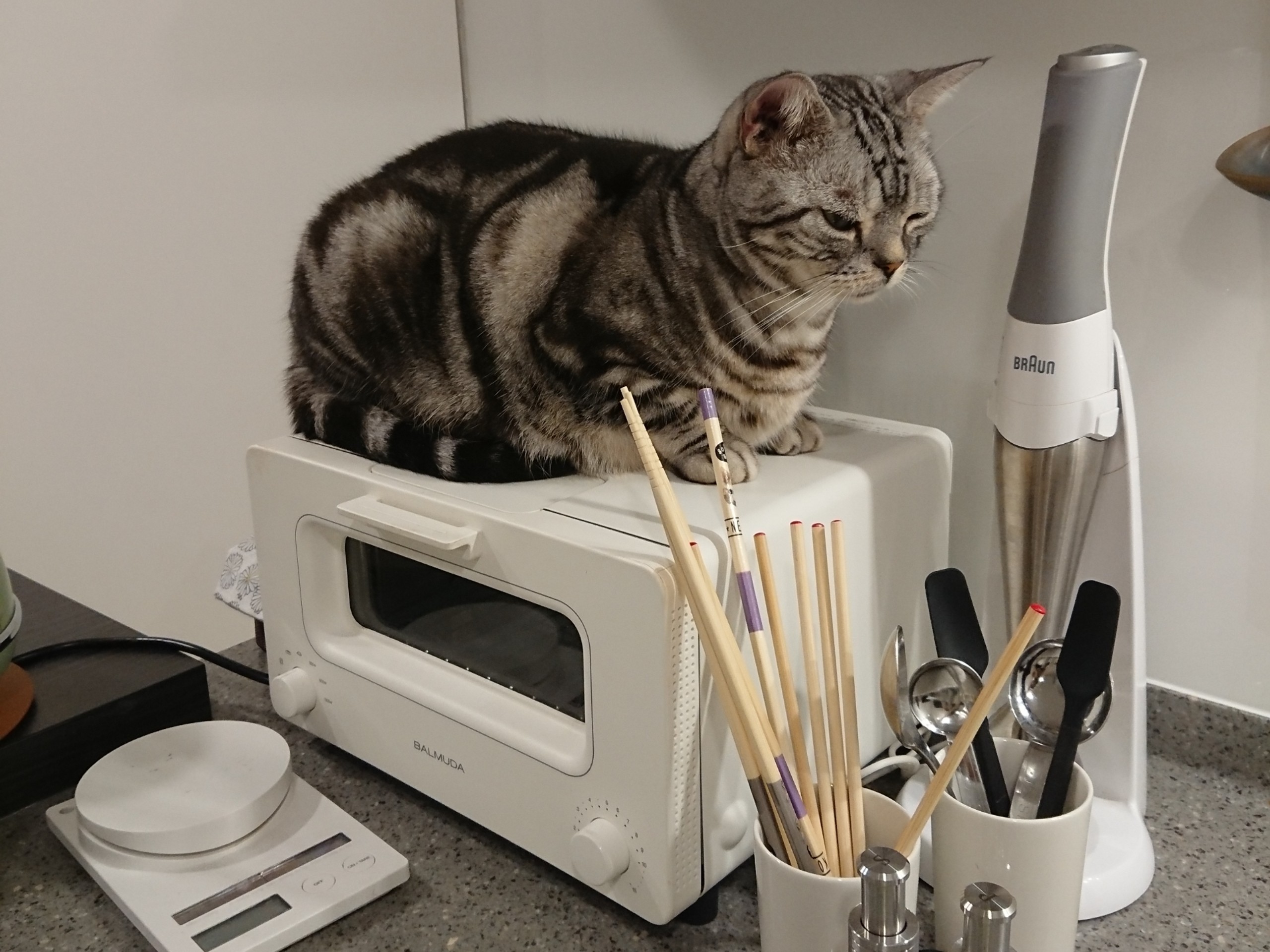 我が家のトースターはピザを焼く石版が付いていて、それをトースターの上に置くとその上に座るし、屋根が凹み、収納にも困ったので、板4枚でコの字型の囲いを作り、電子レンジの上に。前後は開けてます。石版だけじゃなくバット類もトースターと板の隙間に入れました。今は板の上に炊飯器とポットを乗せてます。たまにその狭い隙間に入ろうとしてますが、さすがに無理( ̄▽ ̄)