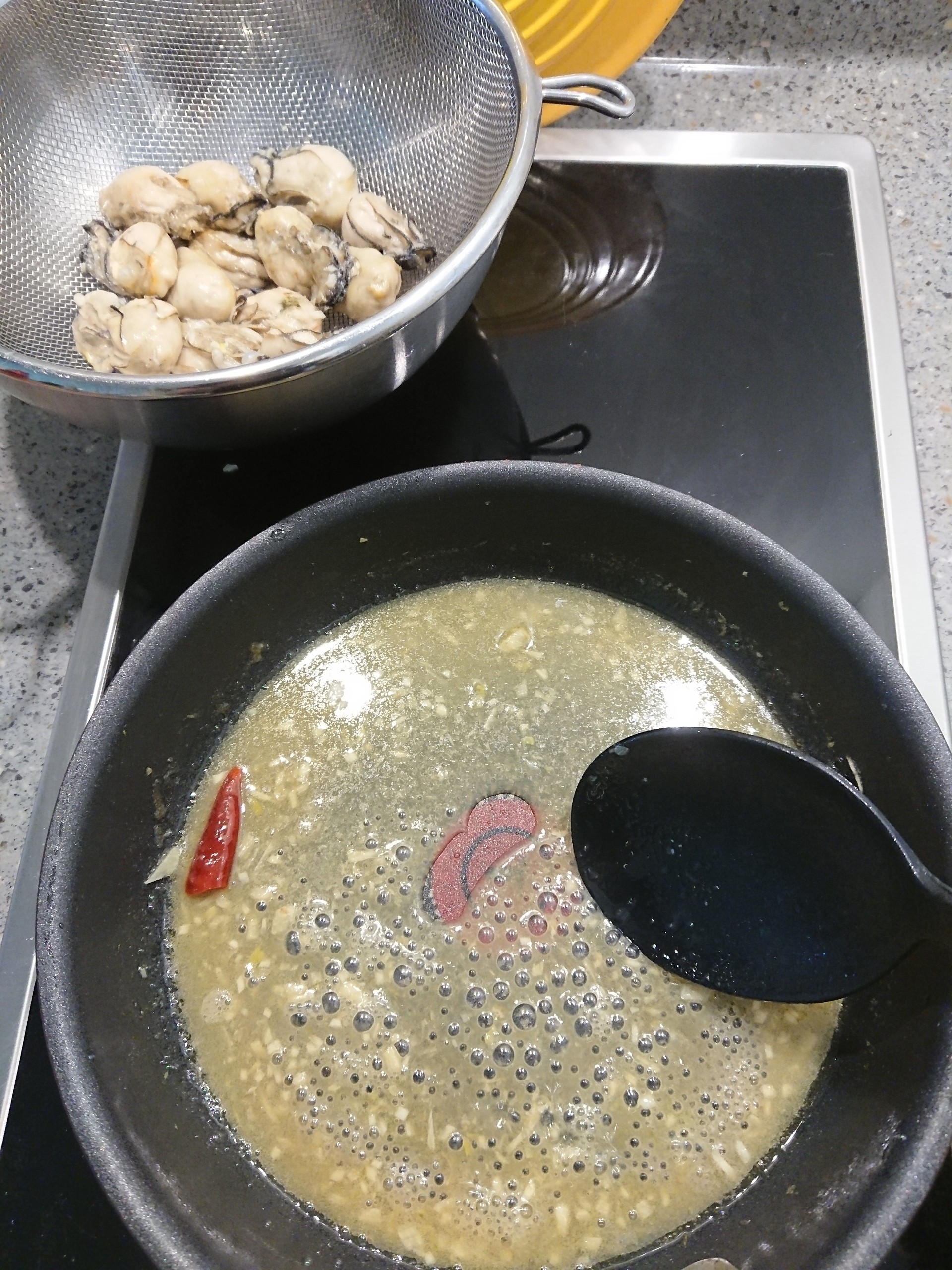 牡蠣を、にんにくと唐辛子白ワインと一緒にオリーブオイルで形が崩れないようそっと炒めて