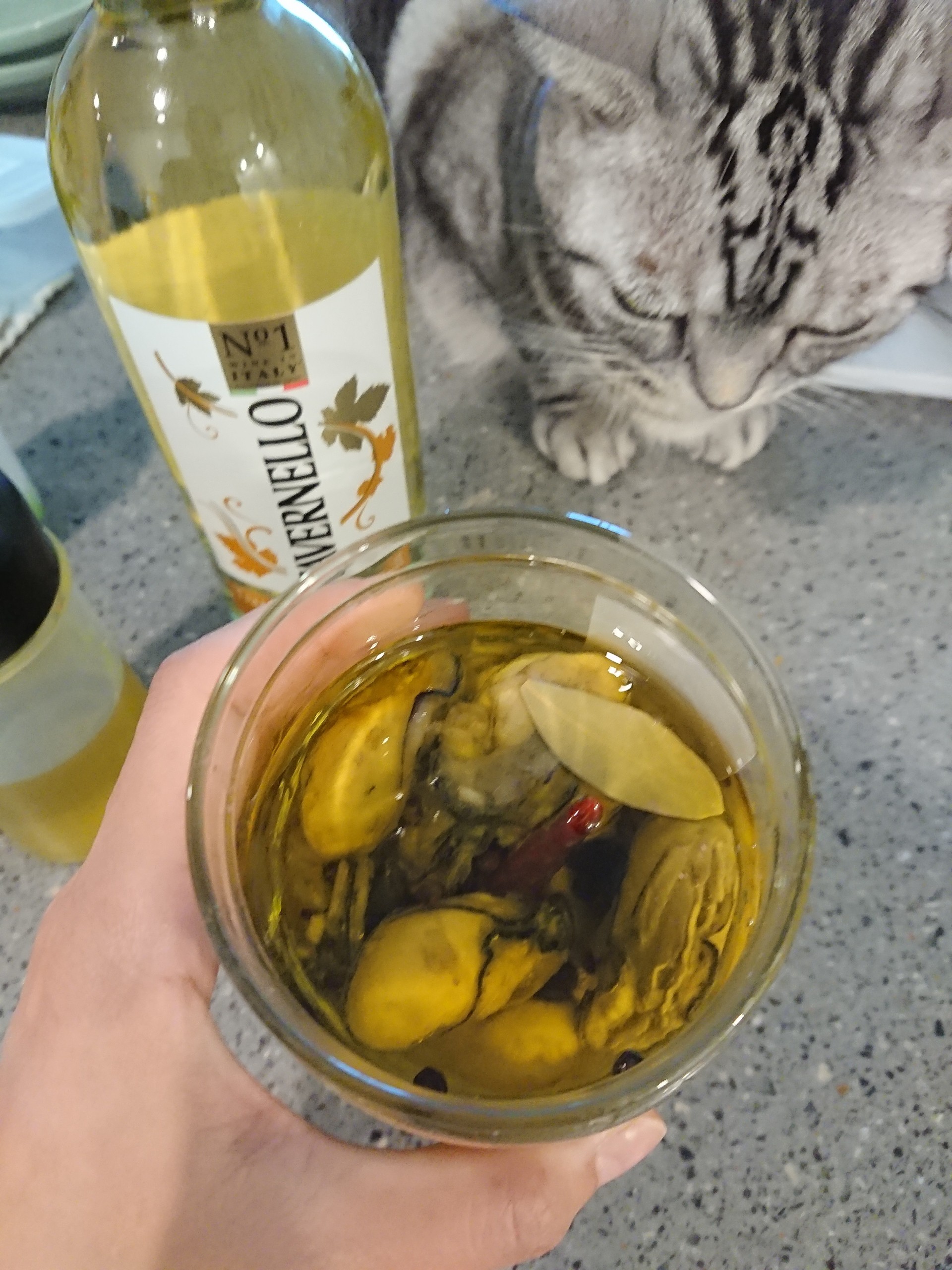 最後に煮詰めたスープに牡蠣を戻して、ホールの黒コショウとベイリーフを入れて、牡蠣が隠れるくらいまでオリーブオイルを足して出来上がり★