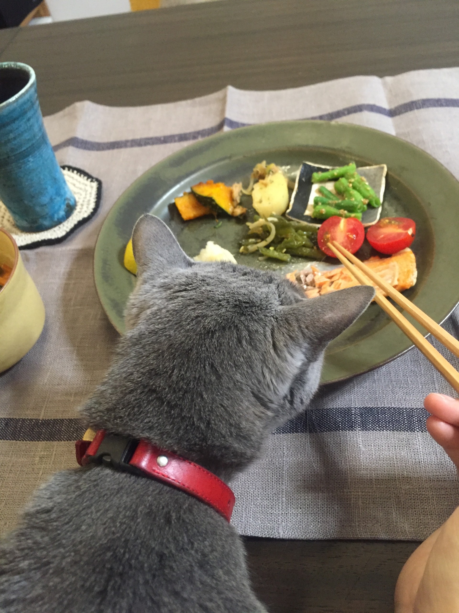 今の坊主は人間の食事に全く興味が無いし、教えた訳でもないのにテーブルには乗りません。自分用の椅子に立ち、前のめりでお皿の匂いを嗅ぐとまた椅子の上で座って眺めてるだけ。