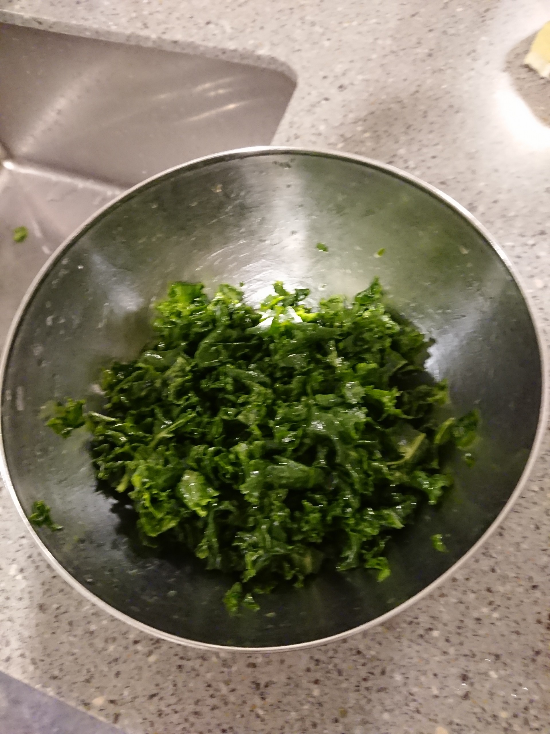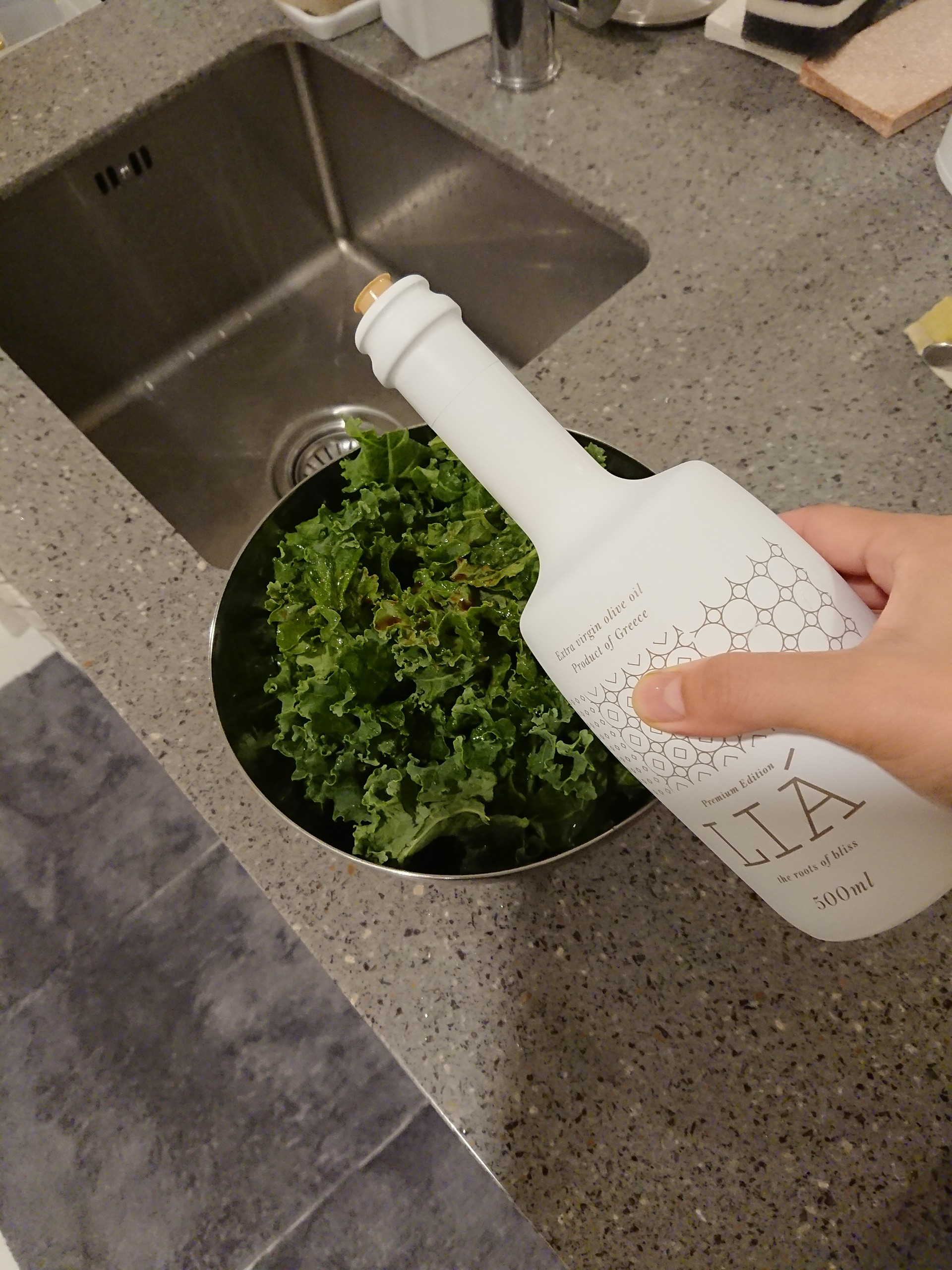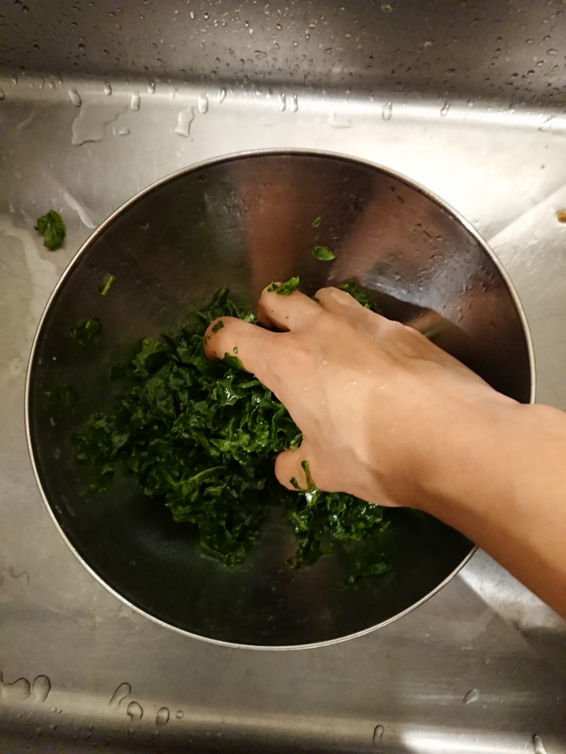 わたしは茎は取り除いて葉を塩もみしてからサラダにしたりしてたんですが、お友達に「ケールは油、酸、塩でマッサージするといいよ。」と教えてもらったら、これが本当に美味しい!。もりもり食べれる!!