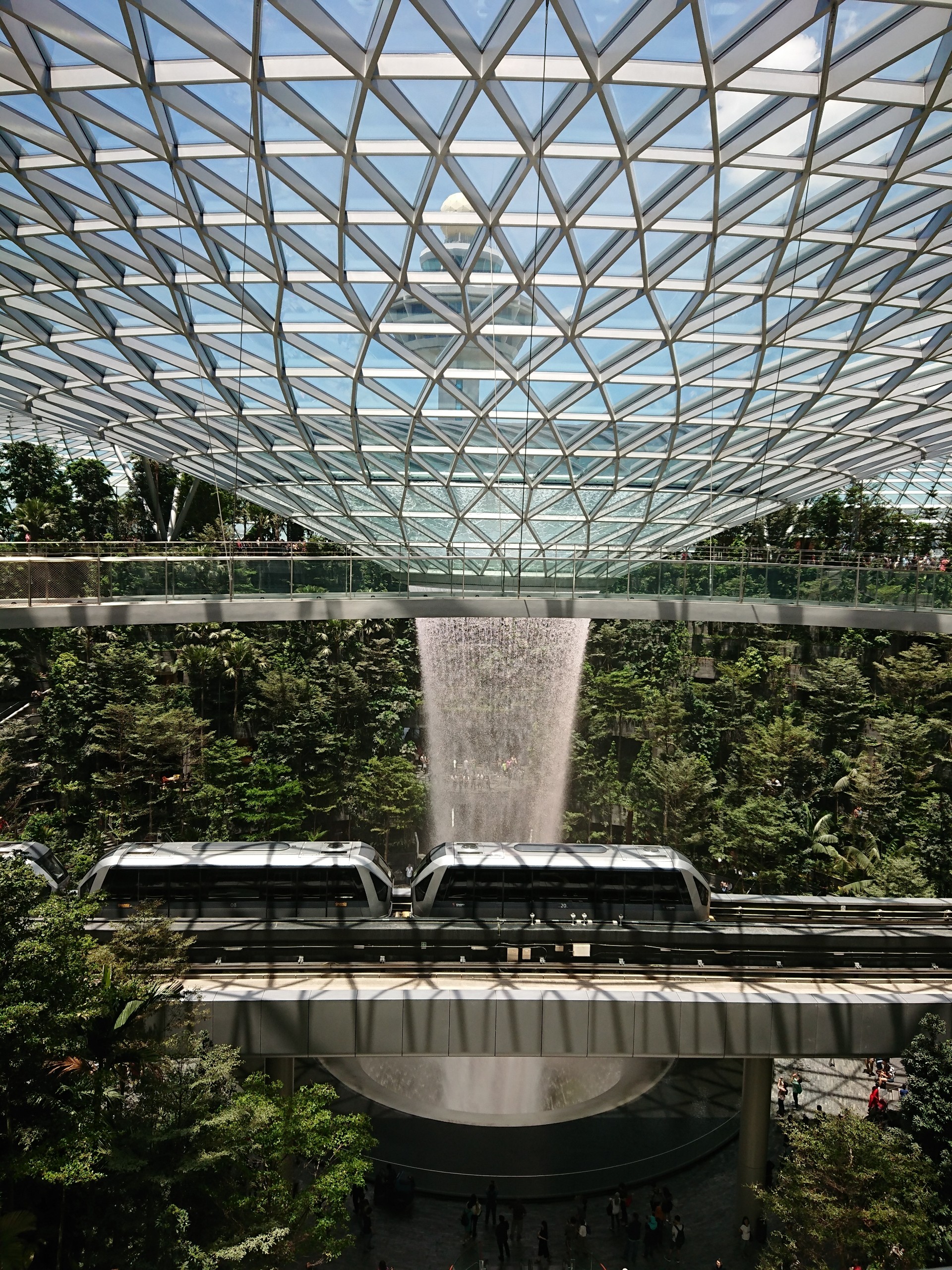 滝の前をスカイトレイン(ターミナル間を繋いでる電車)が通ってます。