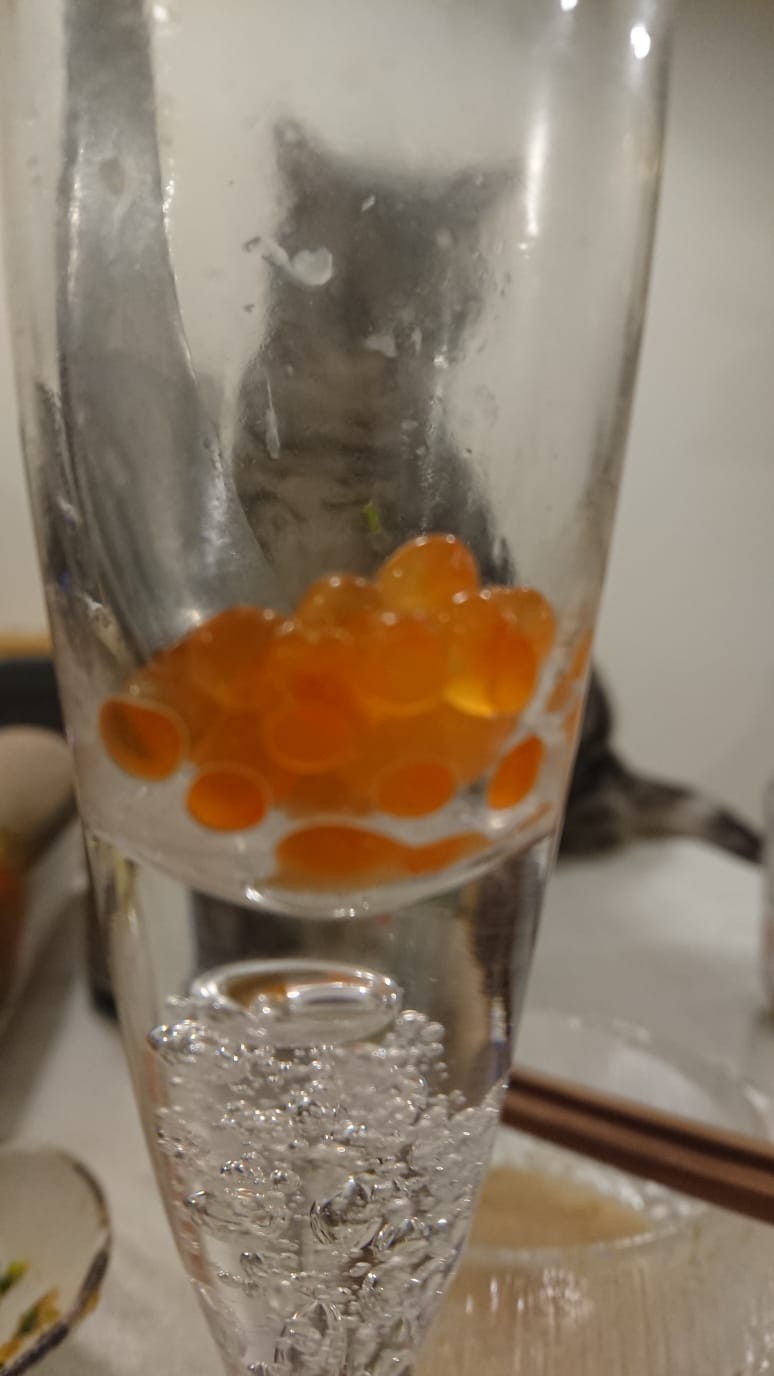 痛風カクテルに乗った大葉をにゃんず型にするのが、さすがりょこさんです😉