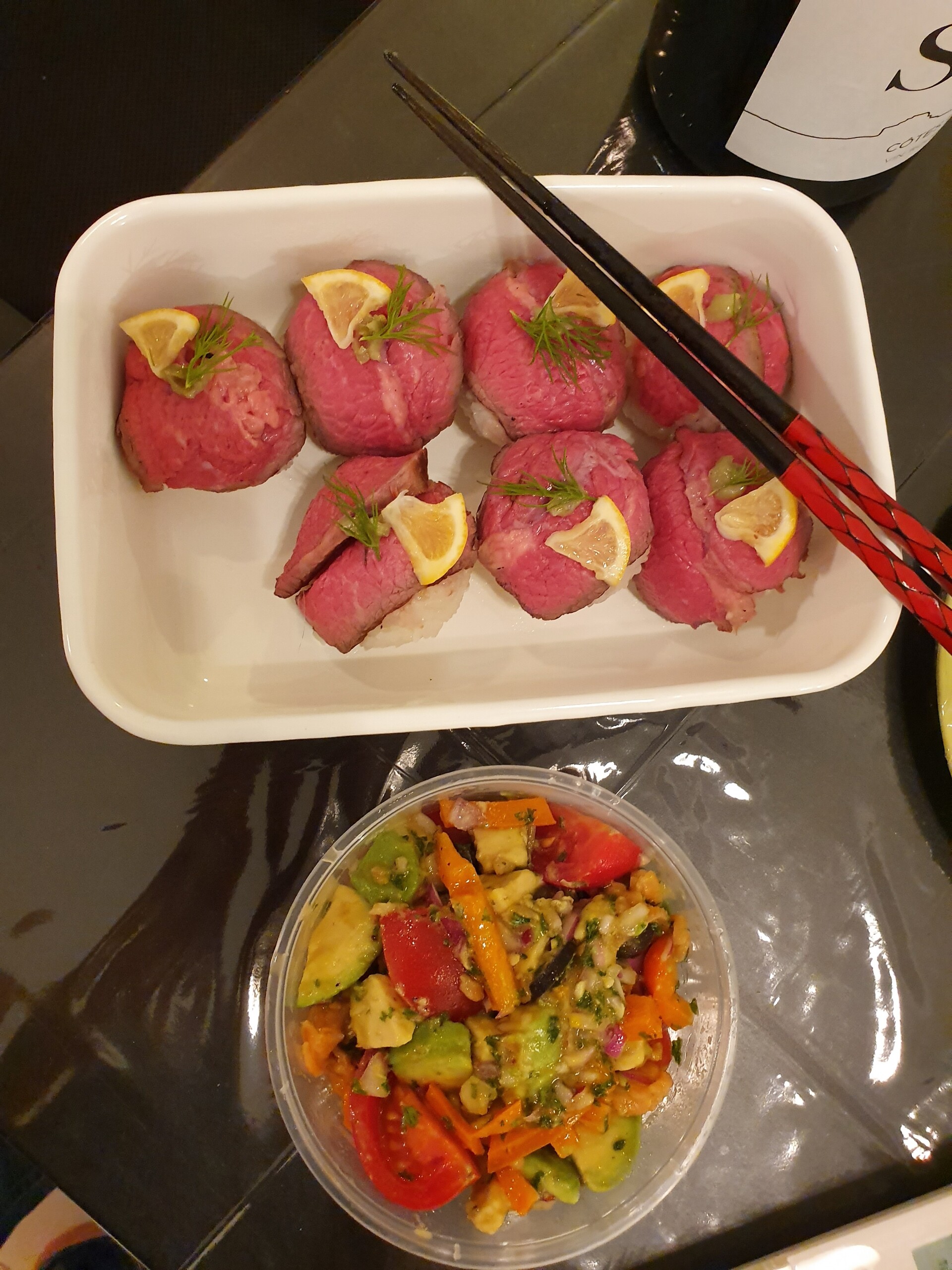 ローストビーフはこの日の前日に、お友達のお家に手まり寿司作った時の残りです。