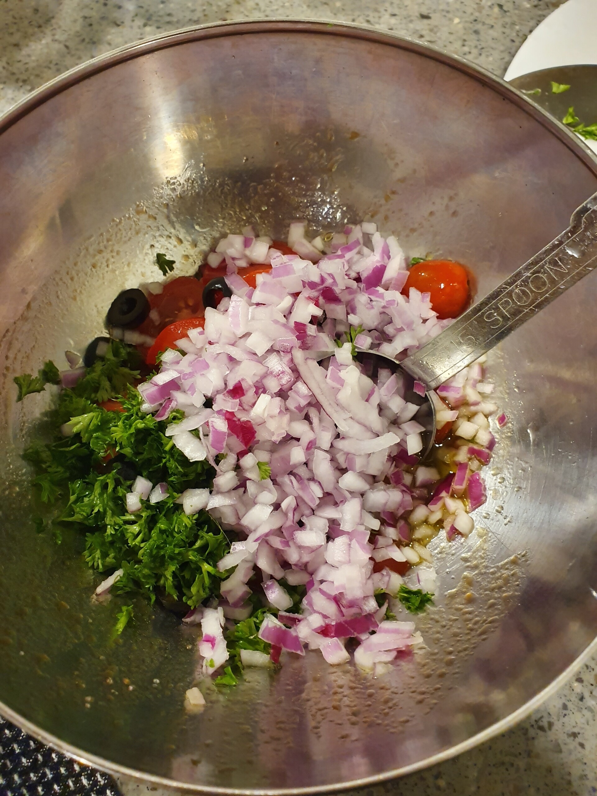 レッドオニオン、パセリ、ブラックオリーブ、ミニトマト、にんにくにバルサミコ酢とオリーブオイルとレモン汁を加えて塩コショウしただけ。