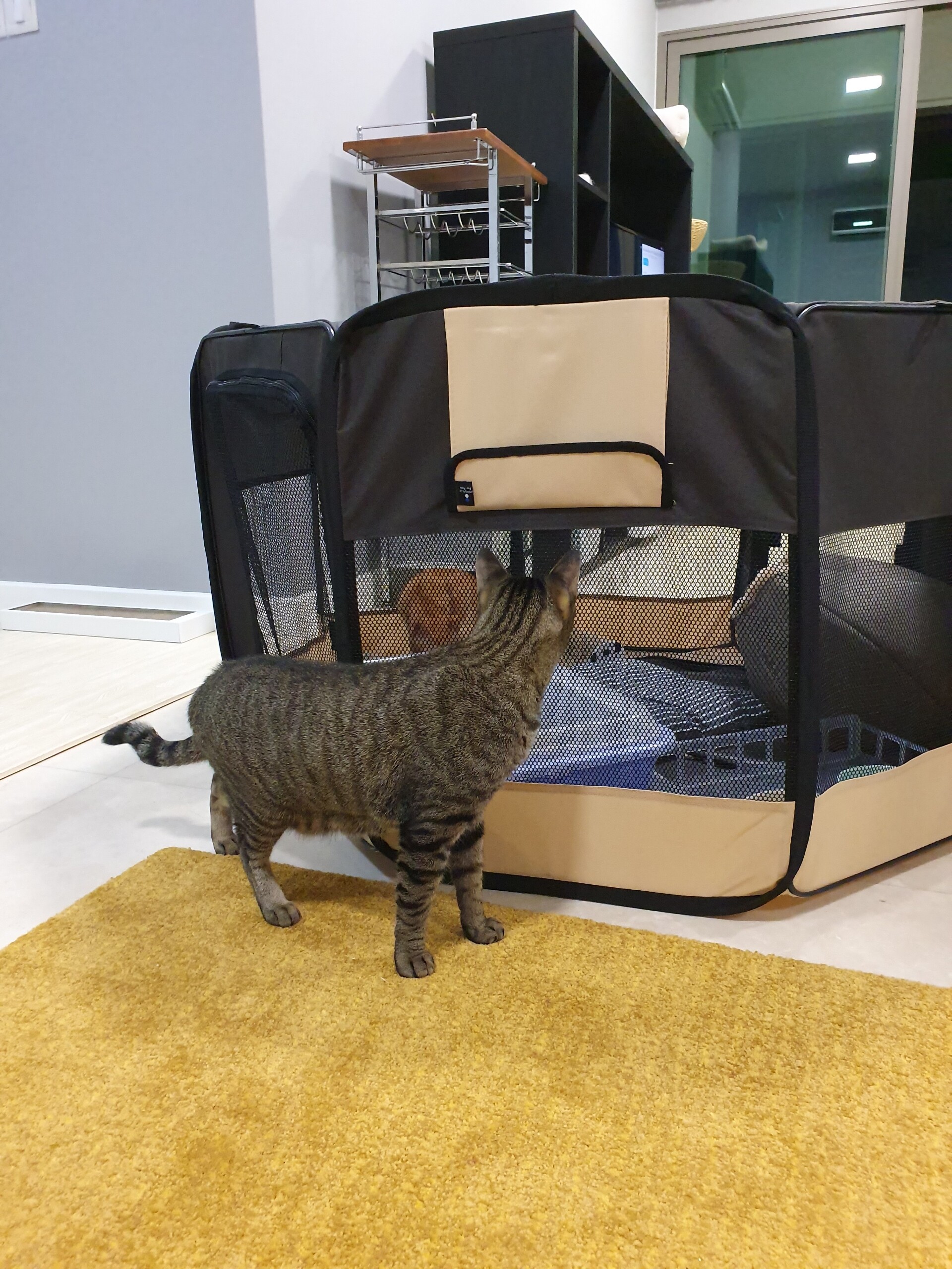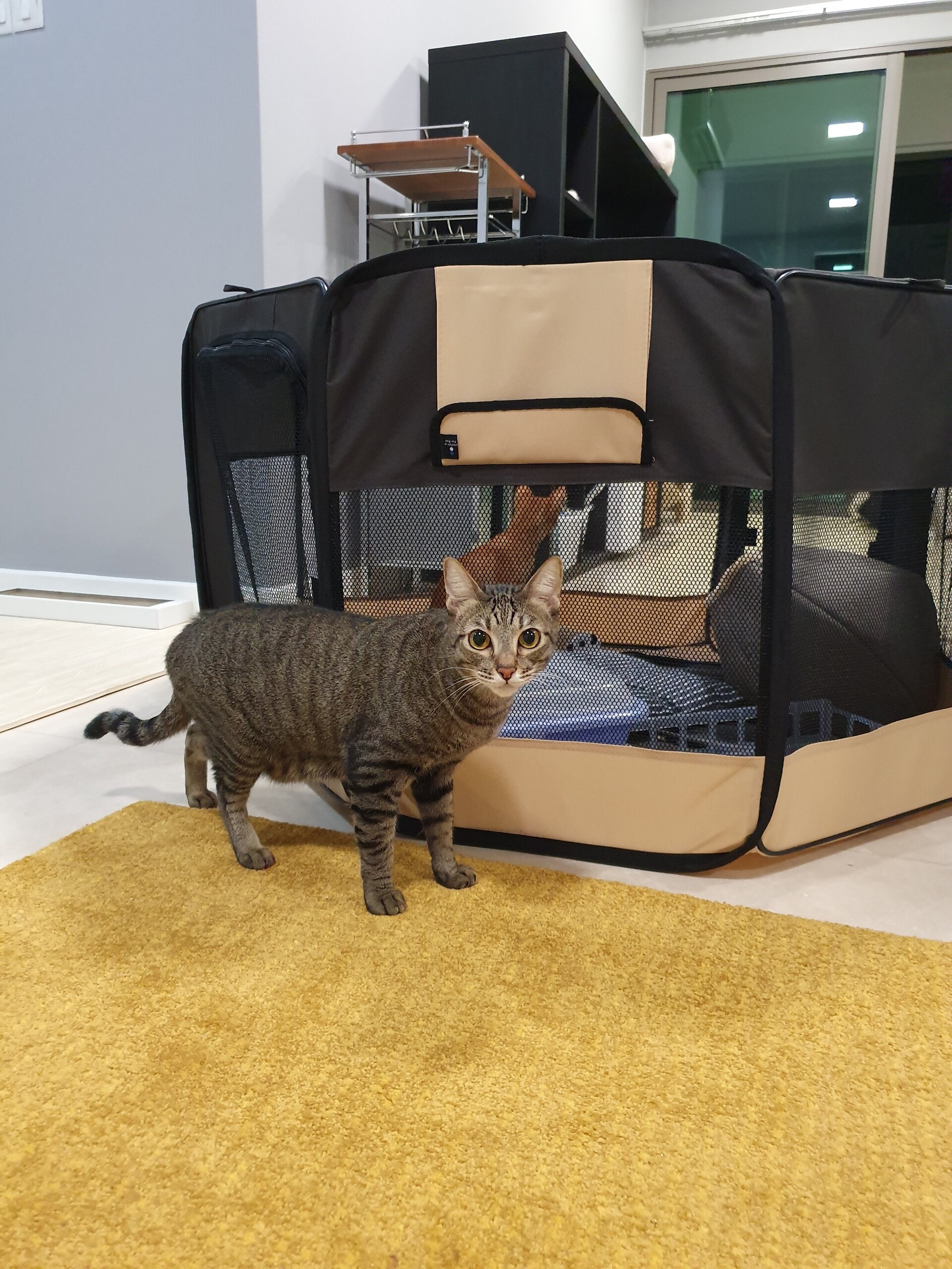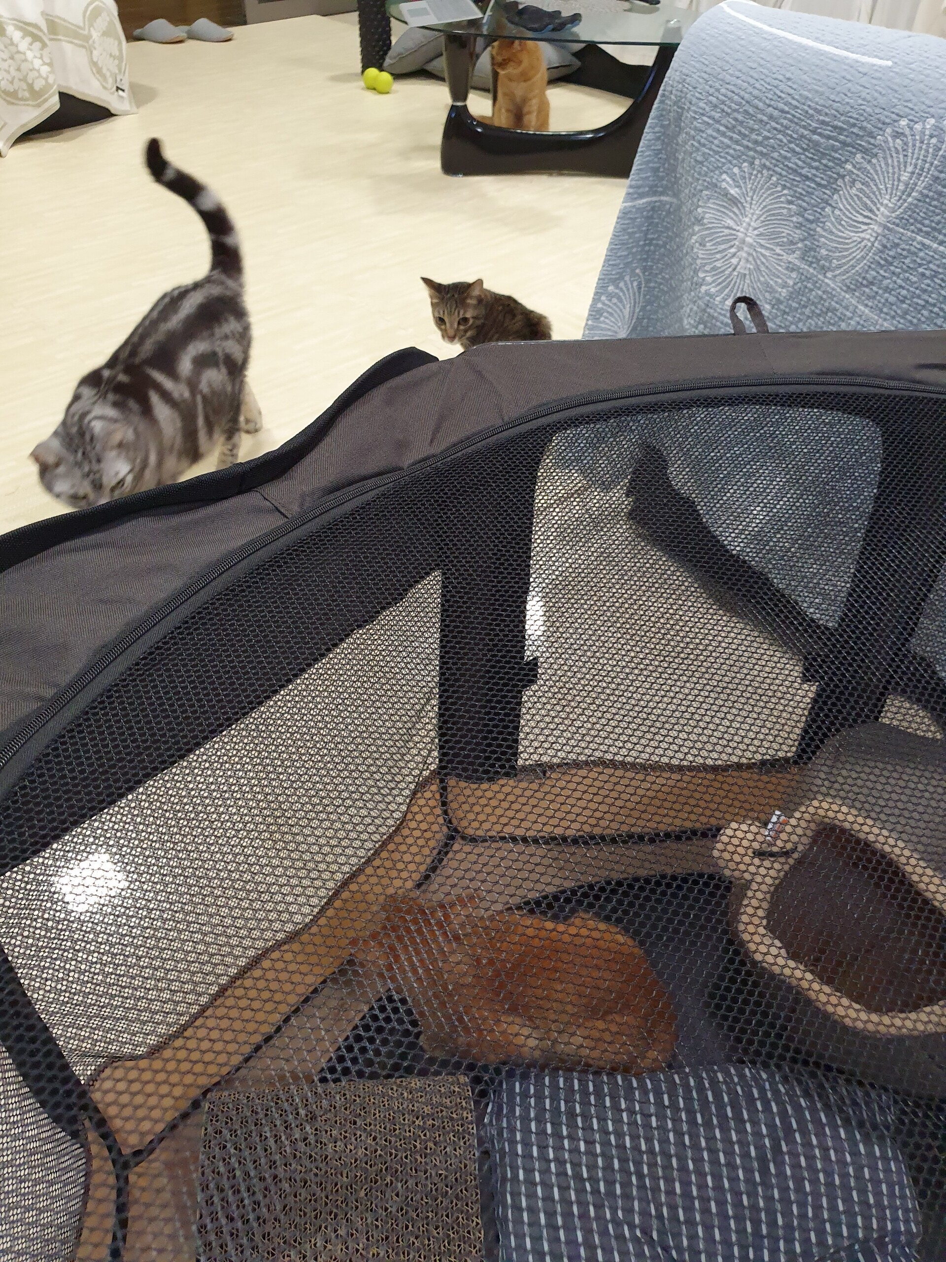周りに猫がいて楽しく遊んでるのが見えたら気になって余計外に出たがるんじゃないか、余計ストレスになるんじゃないか、と…。