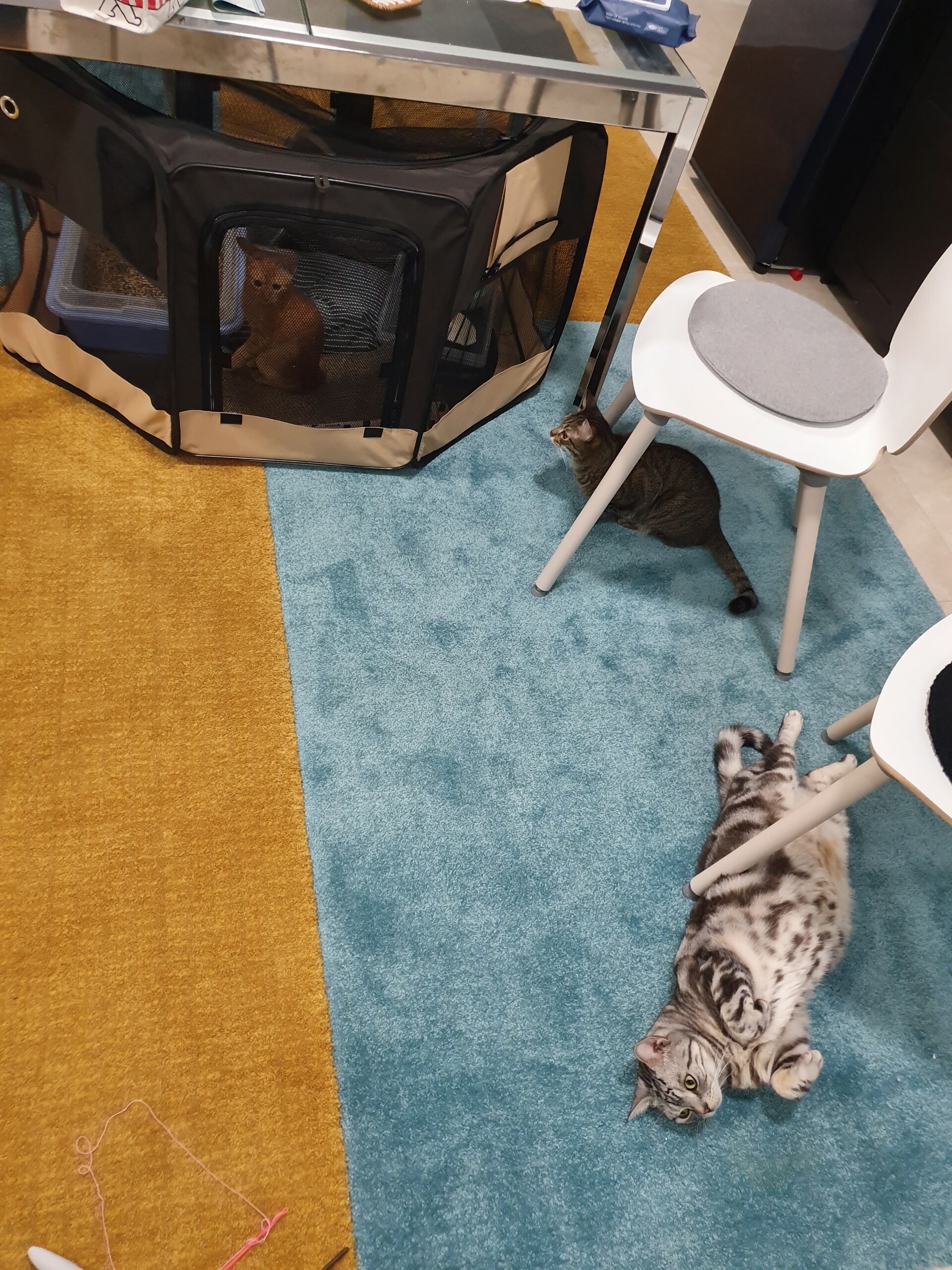 ハクがめっちゃグイグイ行ってて、ケージの上に乗ろうとするのでケージをテーブルの下に移動しました。