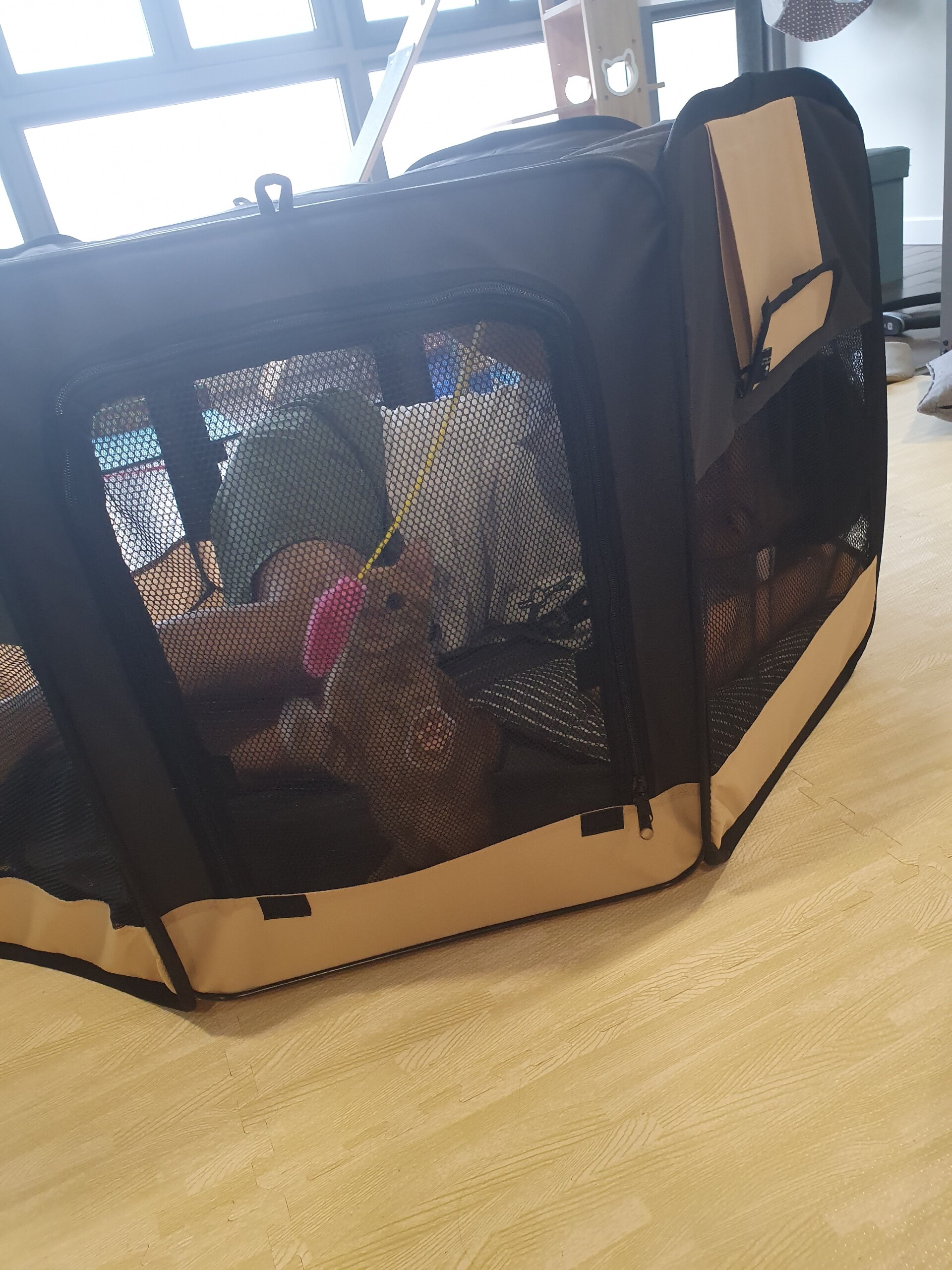 直系114cmの八角形のケージなので、トイレとかを出せばギリ一緒に入れます。