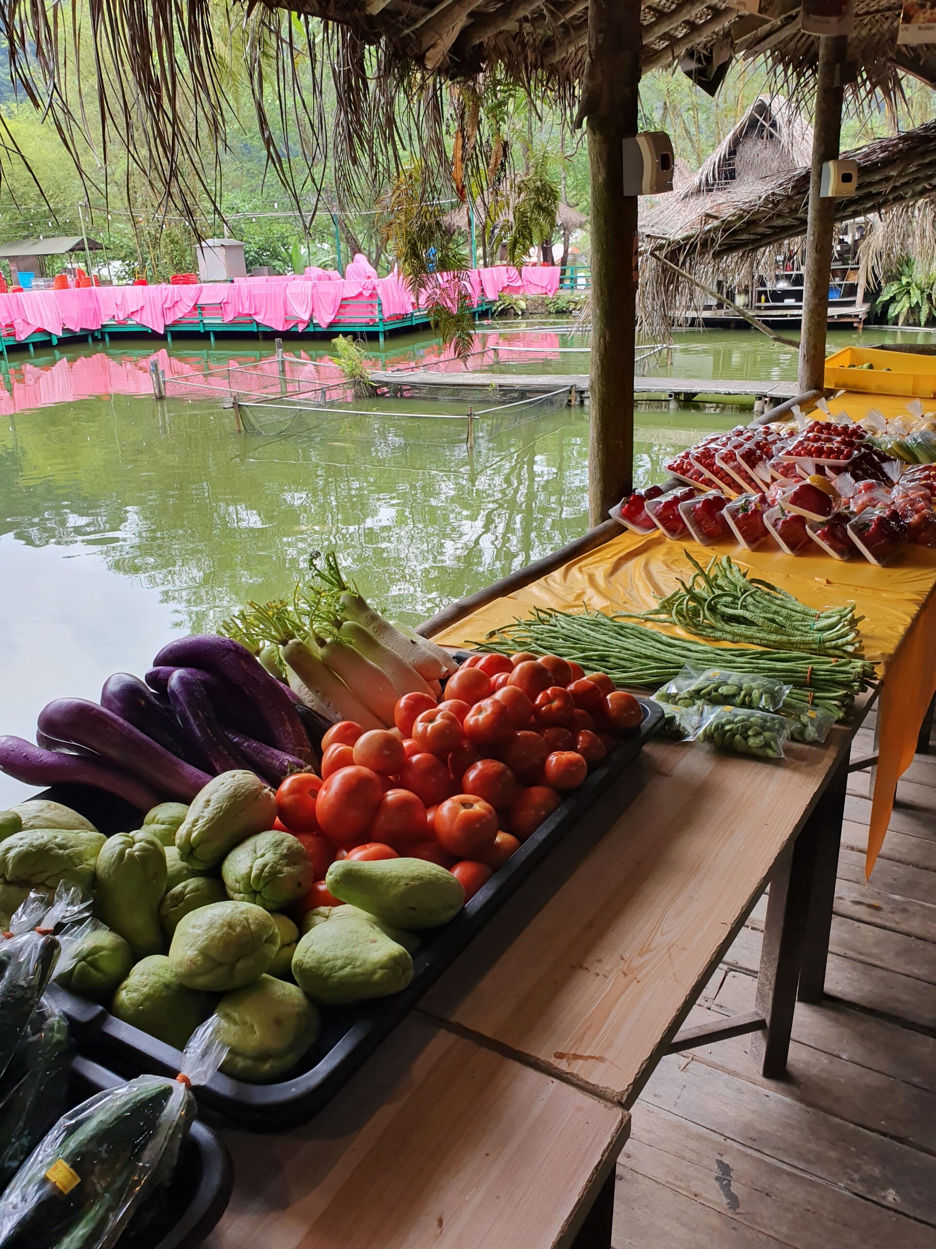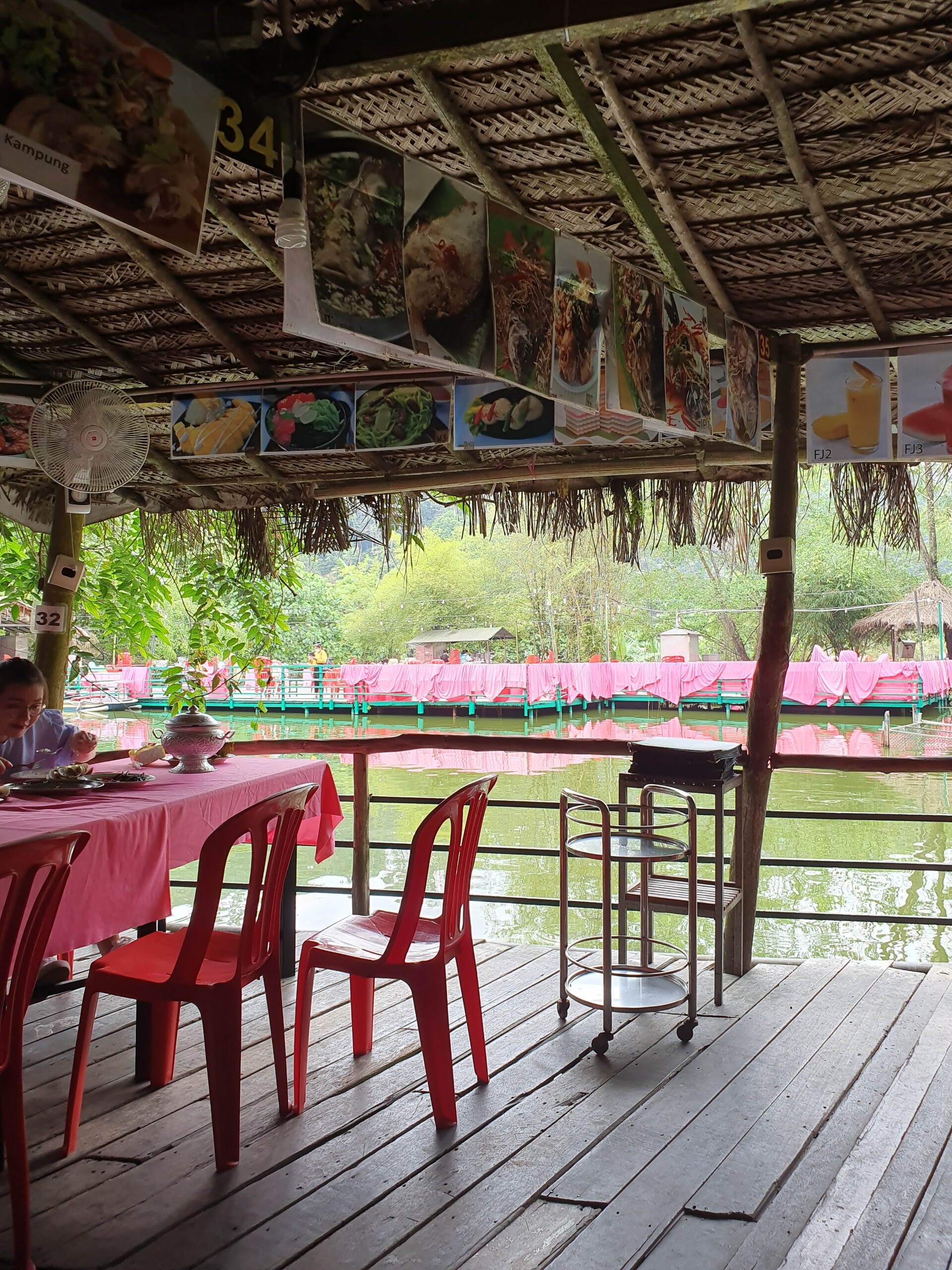 わたし達の席はキッチンから近かったので店員さんが歩いて持ってきてましたが、離れたところだと船で対岸まで持って行ってました。