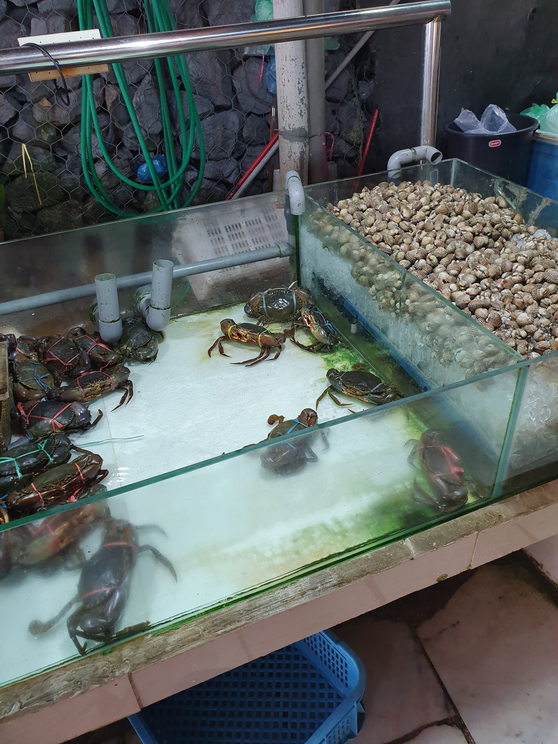 入り口付近には生簀があって、カニや貝、魚がいました。