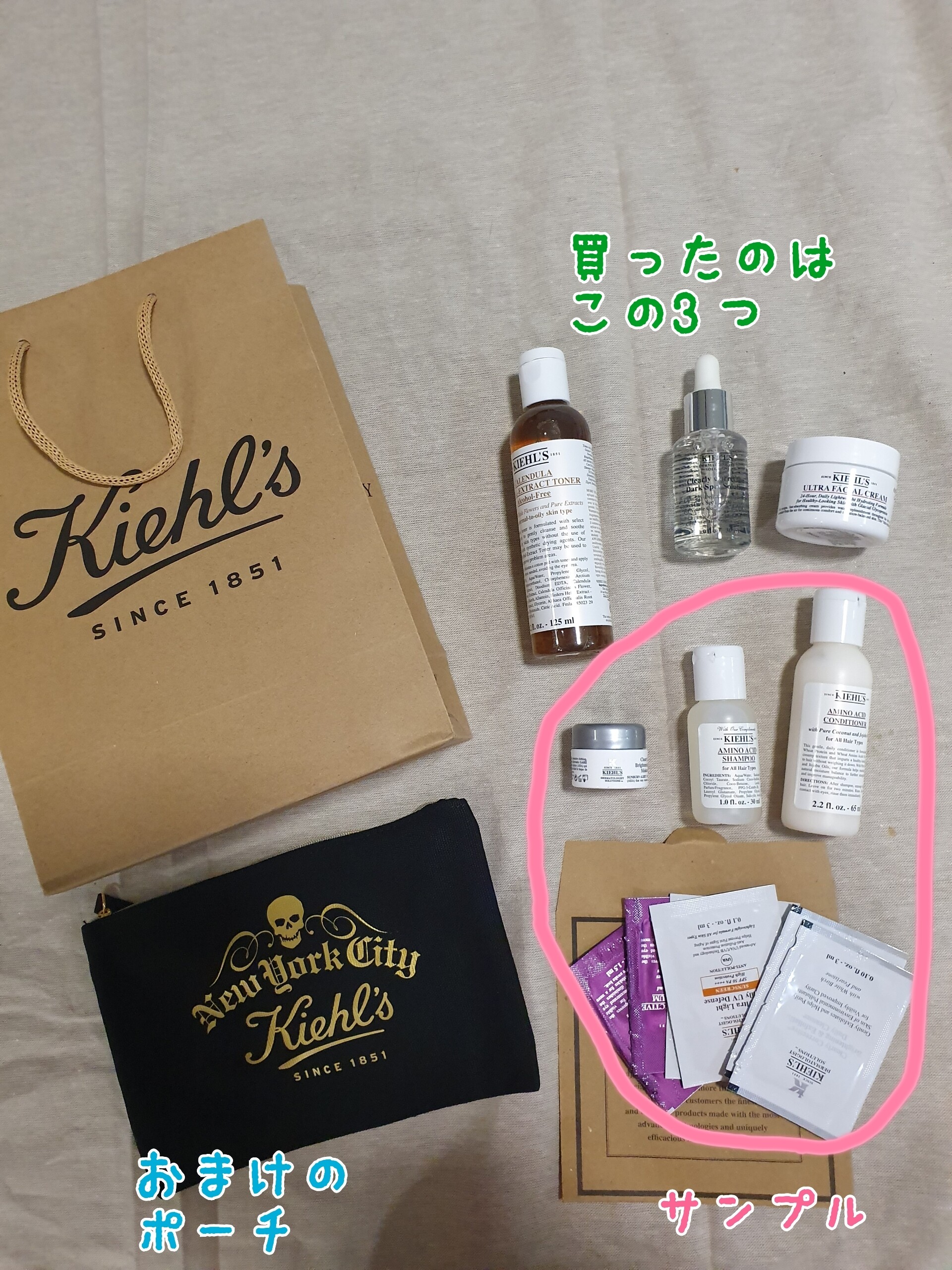 そうそう、キールズでは買った時にこんなにおまけとサンプルをつけてくれました( °_° )