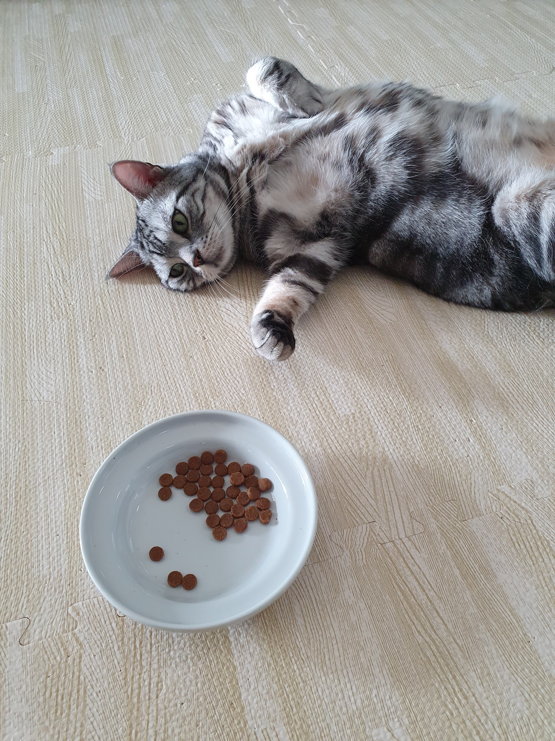 原因が分かって良かった。子供も猫も具合が悪くなる前後は急にいっぱい食べたりするので、食欲全開になるのも近いと思います。