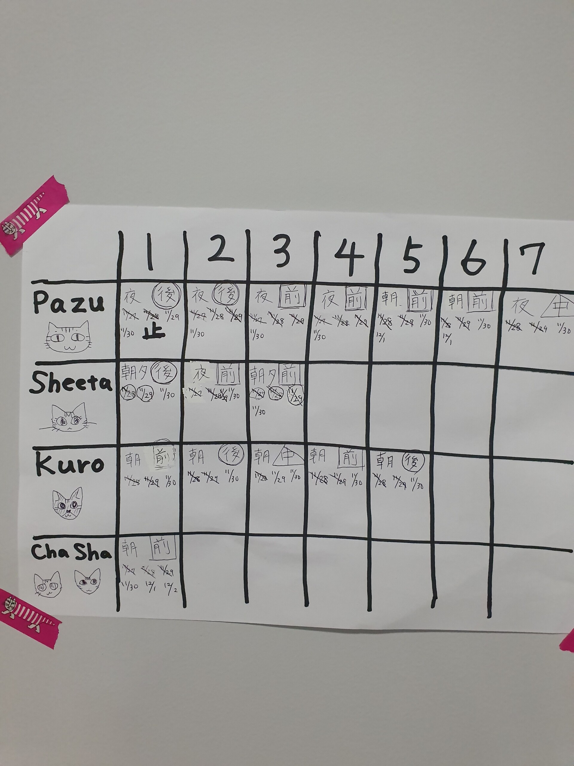 みんにゃお薬やサプリがあって、誰がいつ何を飲むか頭ごっちゃになるので表にしてチェック。