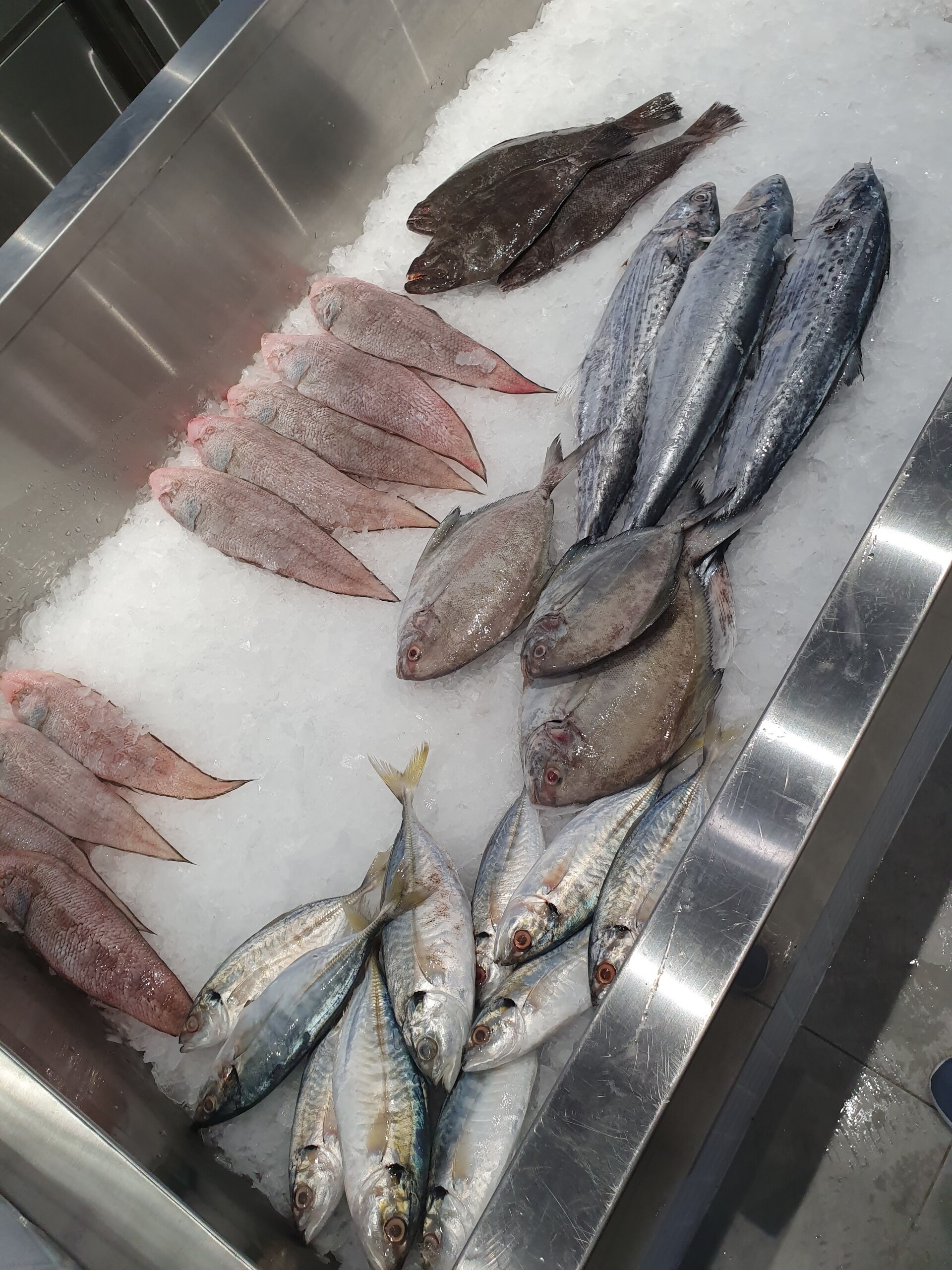 奥から、シタビラメ、クロアジモドキ、カレイ、ヒラメ、シーバス、アジ…かな?