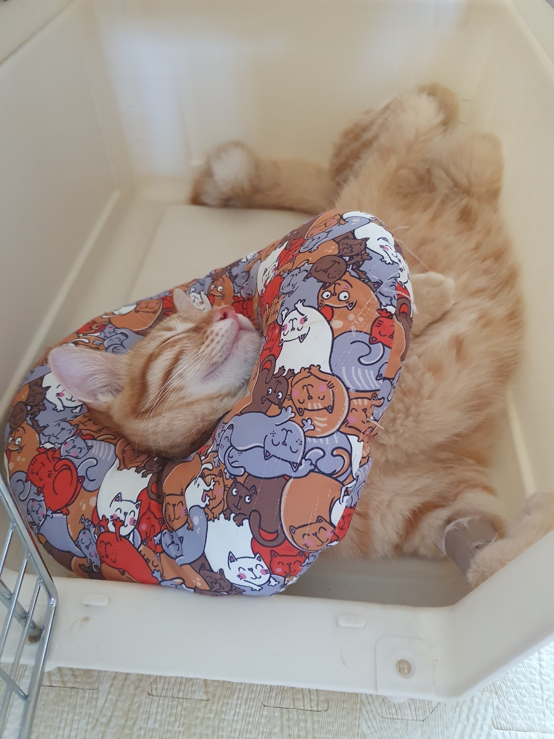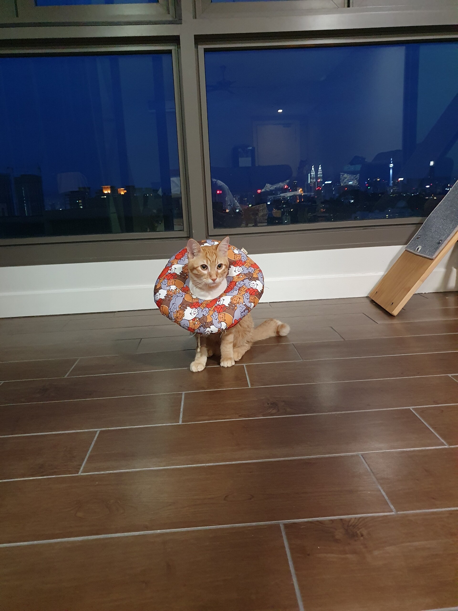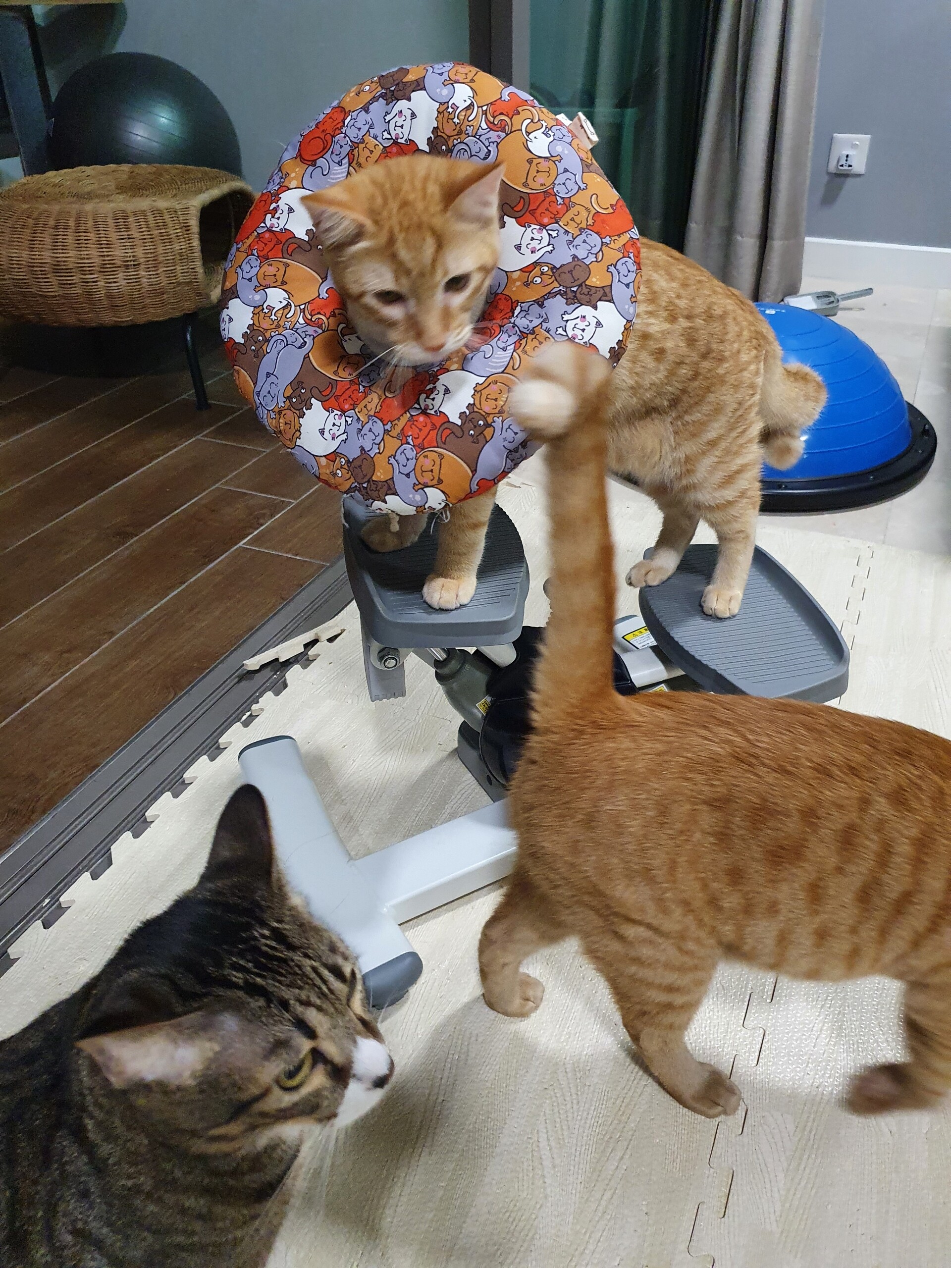 傷が開いたりしないようにもんちゃんだけ隔離した方がいいのかな、とも思ったのですが、自分でセーブしながら動いてる感じがしたのでカラーつけたままフリーにしとくことにしました。