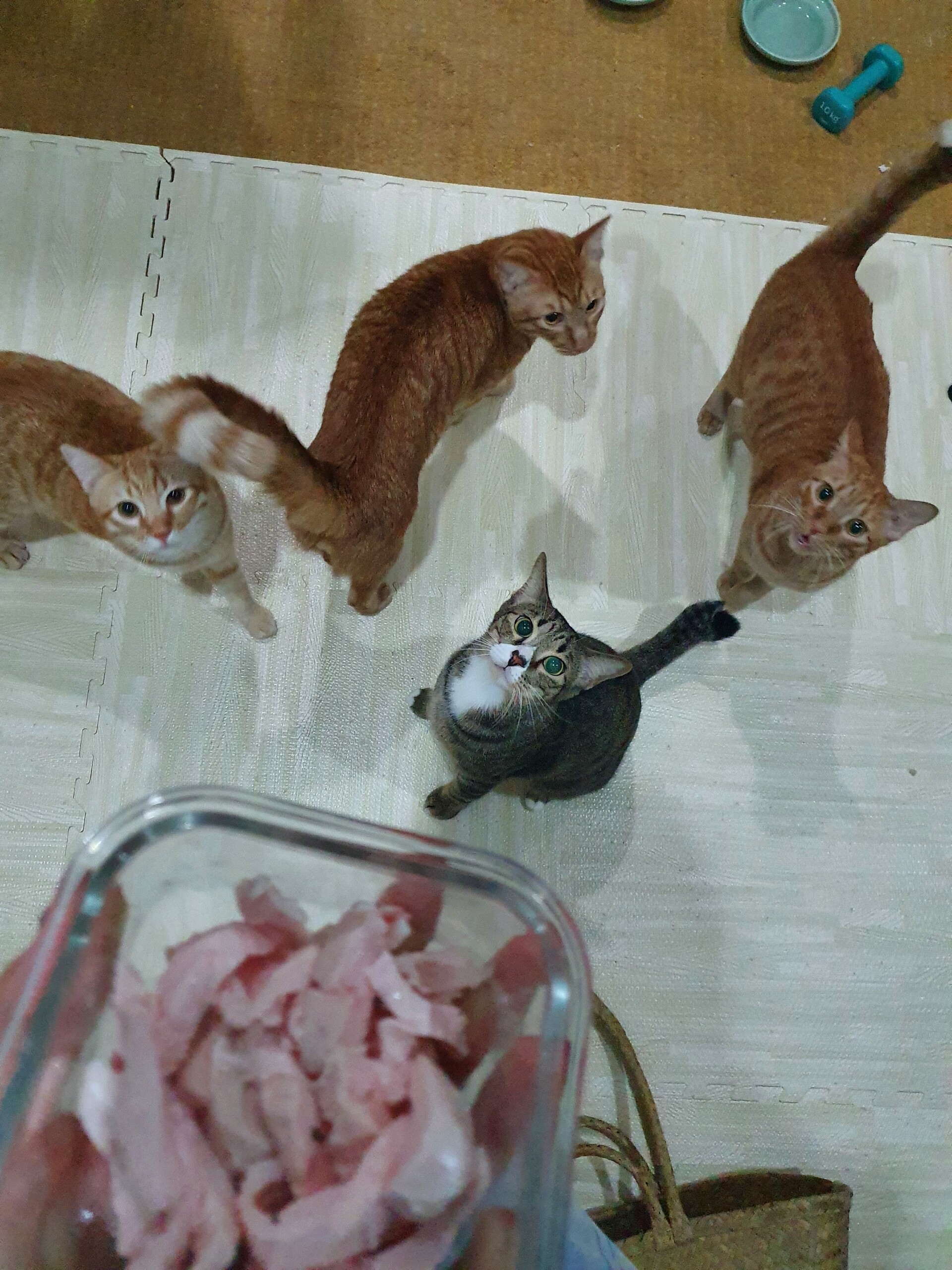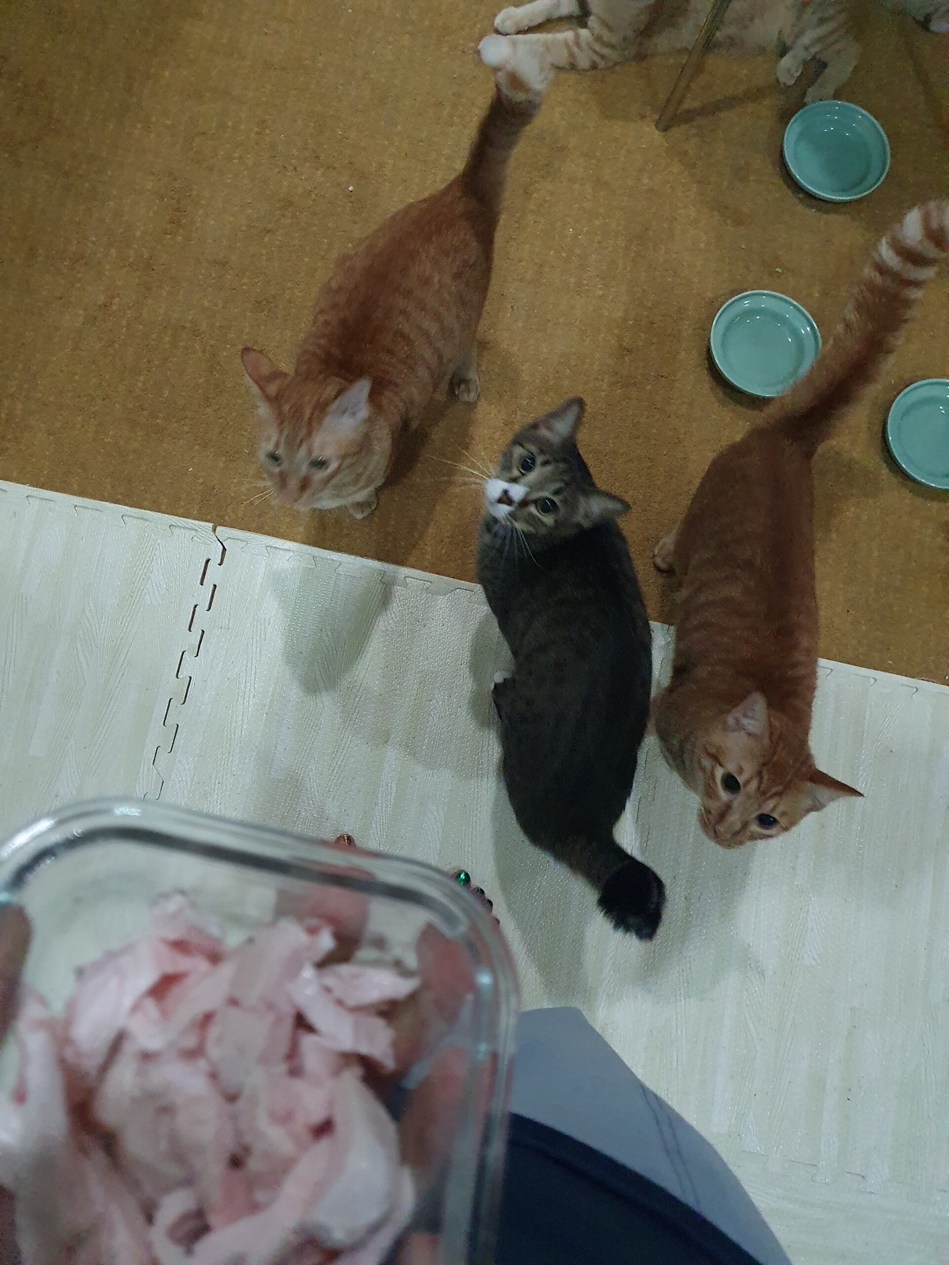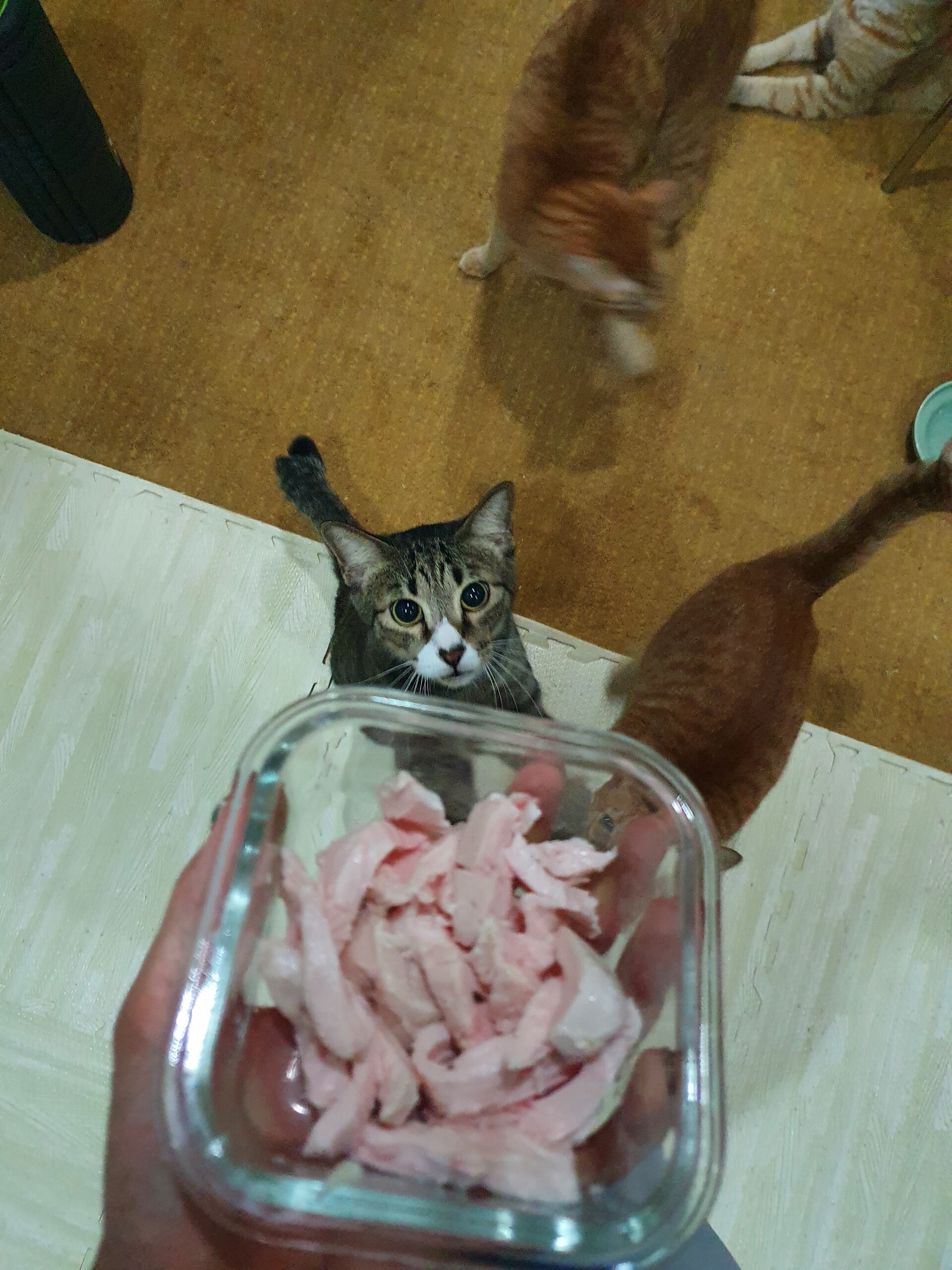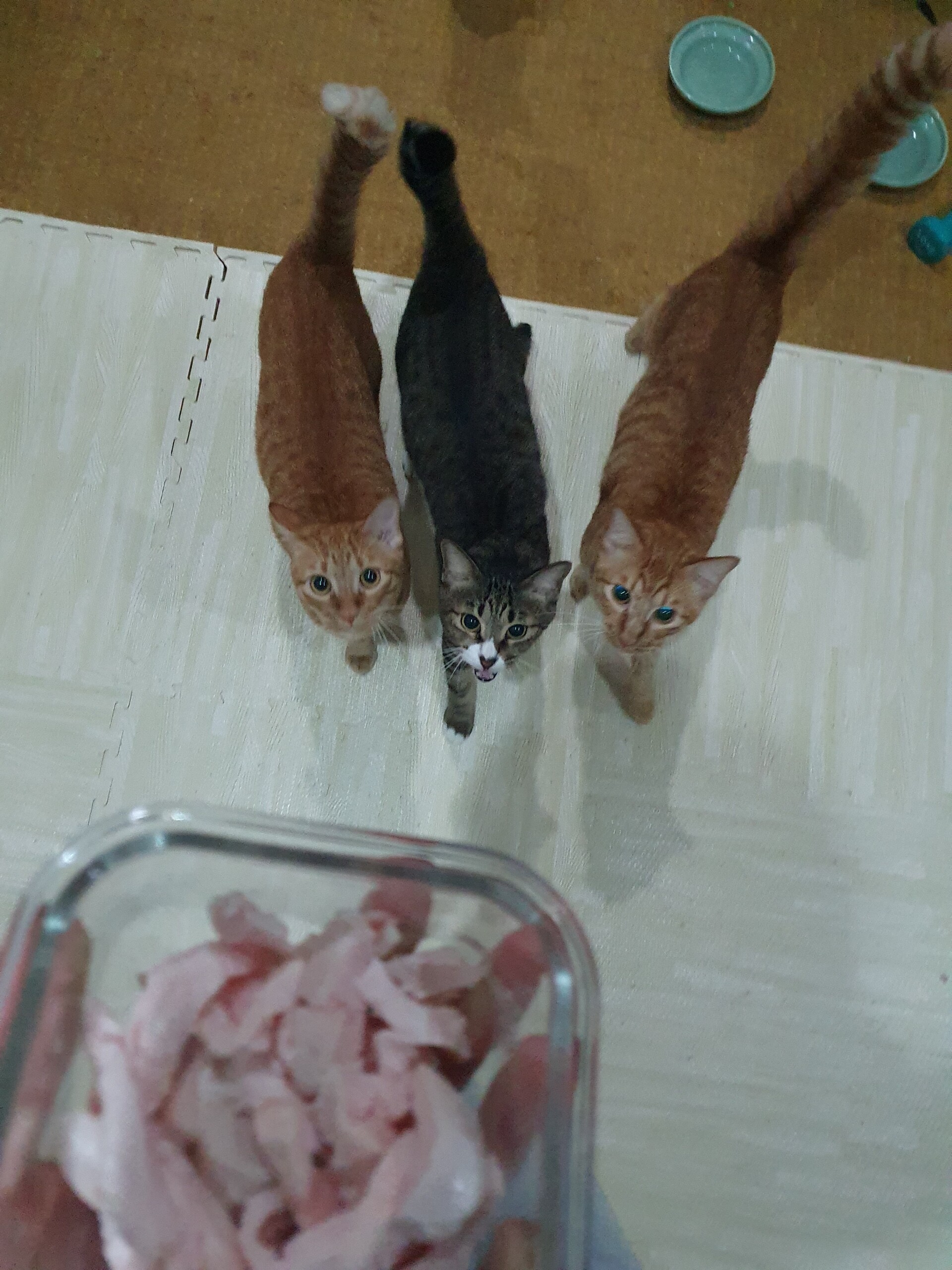 気にはなるものの、三兄弟の熱意に押されて鶏肉になかなかありつけないもんちゃん😅