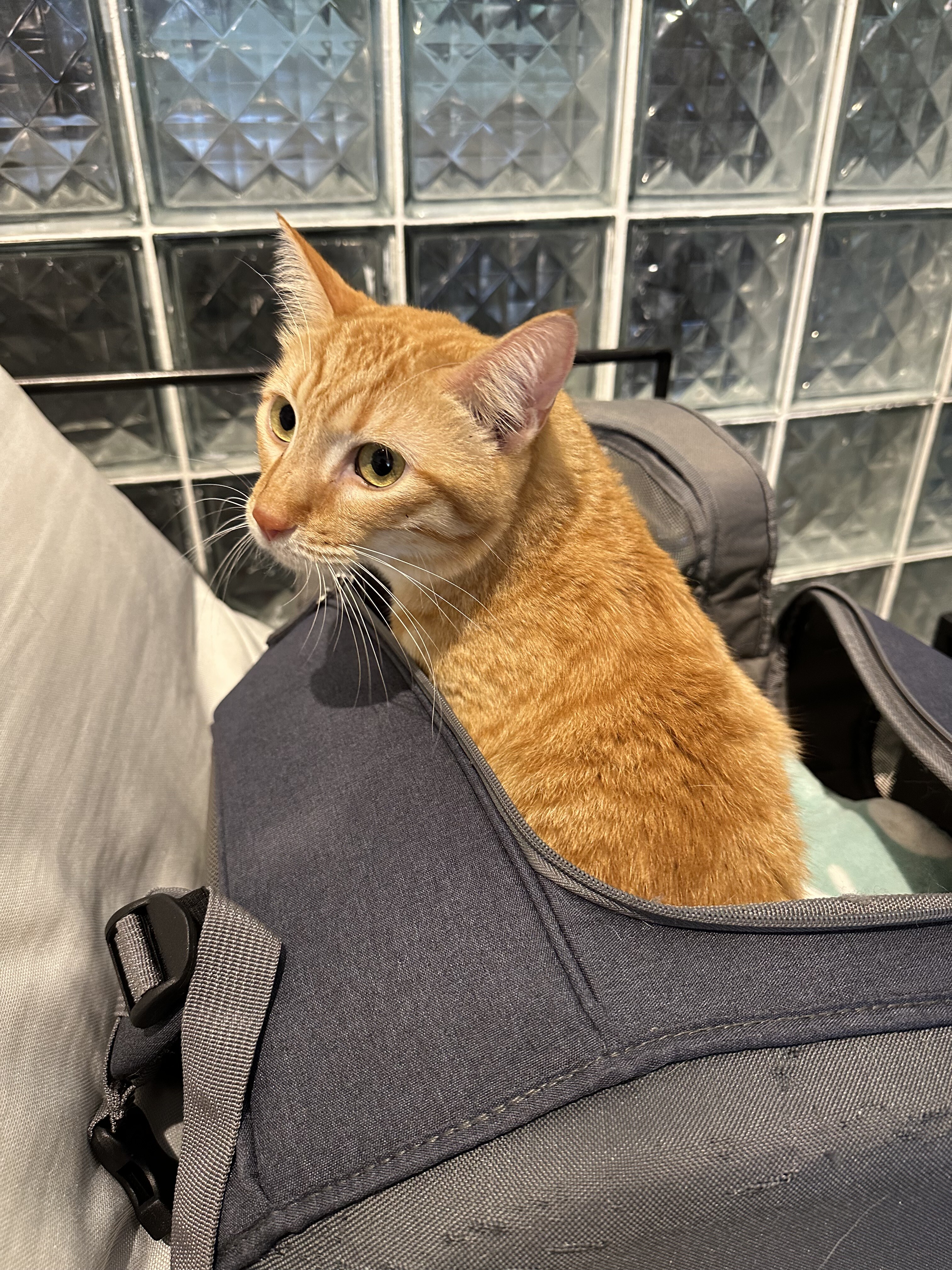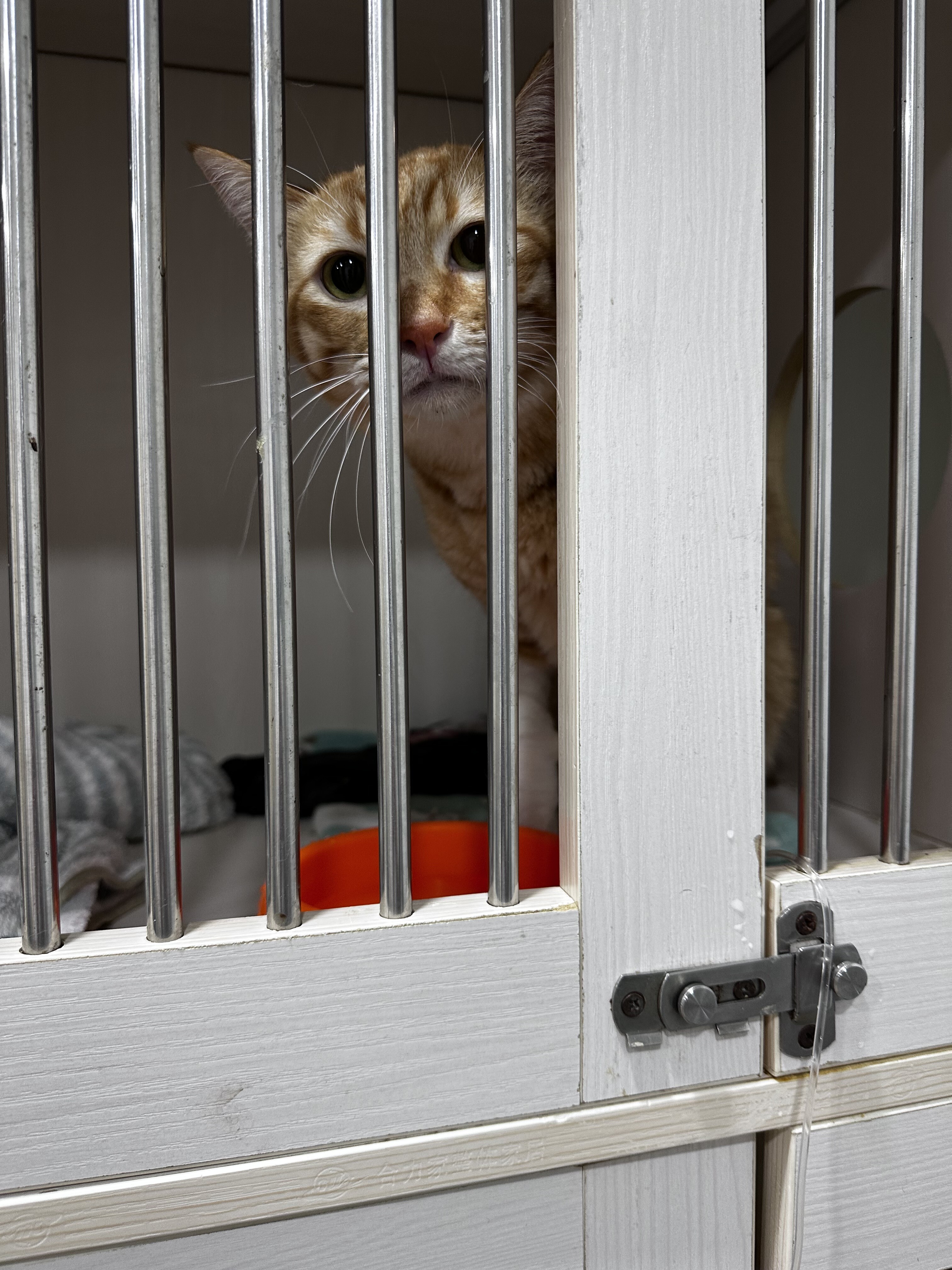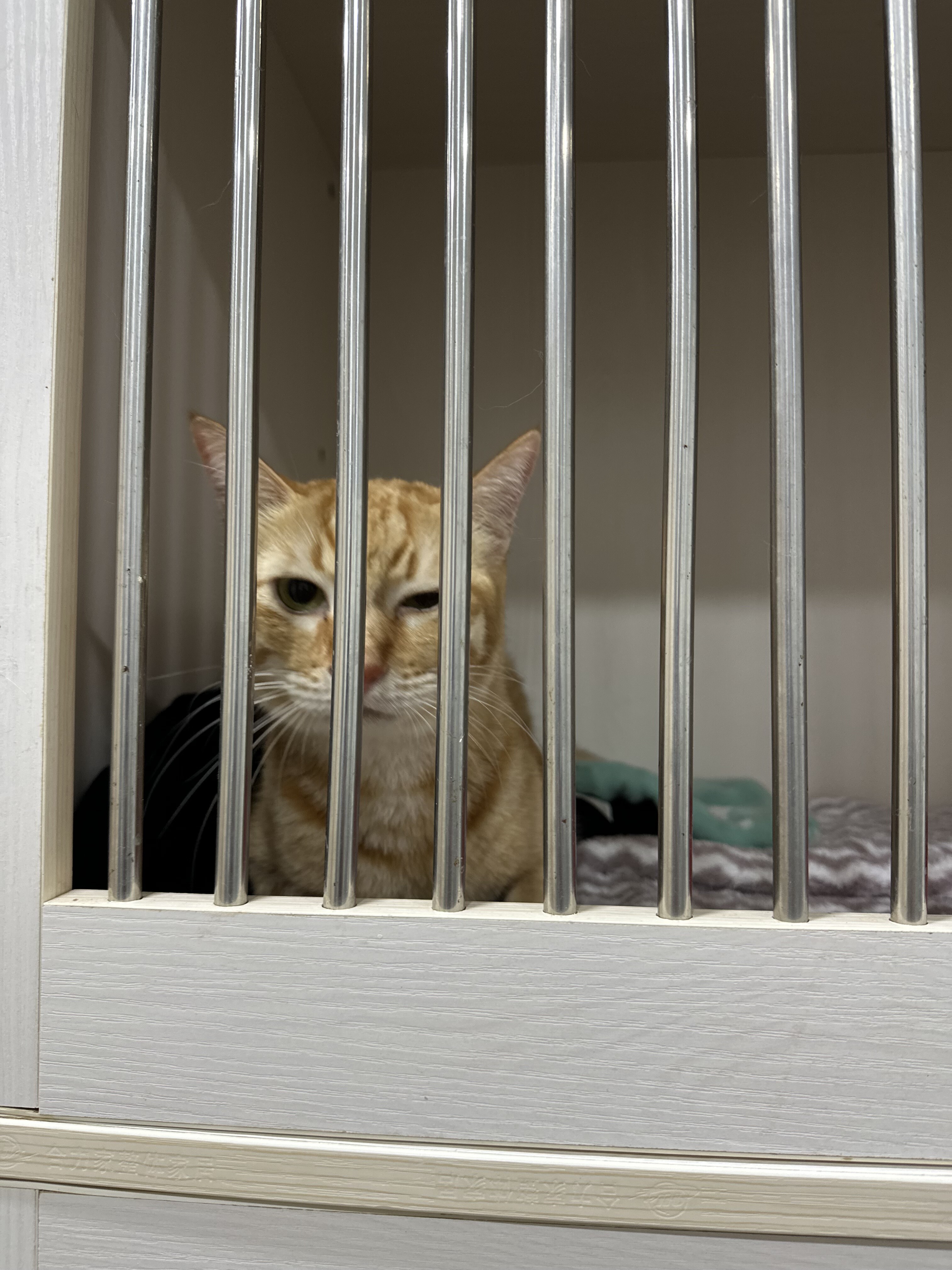 結局、家で使ってた猫砂とたまに使ってるブランケットだけ持ってお見舞いに行ったんですが、病院に入るなり、まだ姿見えないはずなのに入院部屋から「にゃおーーーん!」ともんちゃんの声が。