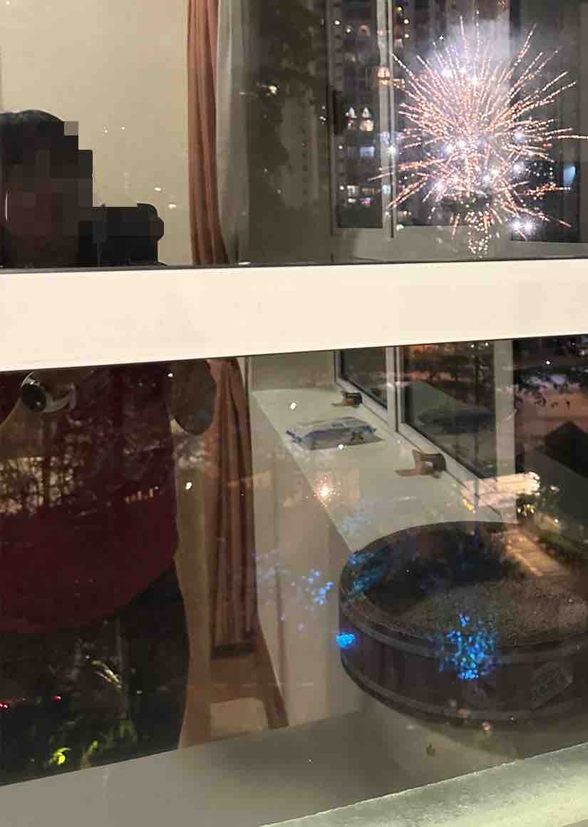ガラスに反射してわかりにくいですが、家の真ん前で上がってる花火です。