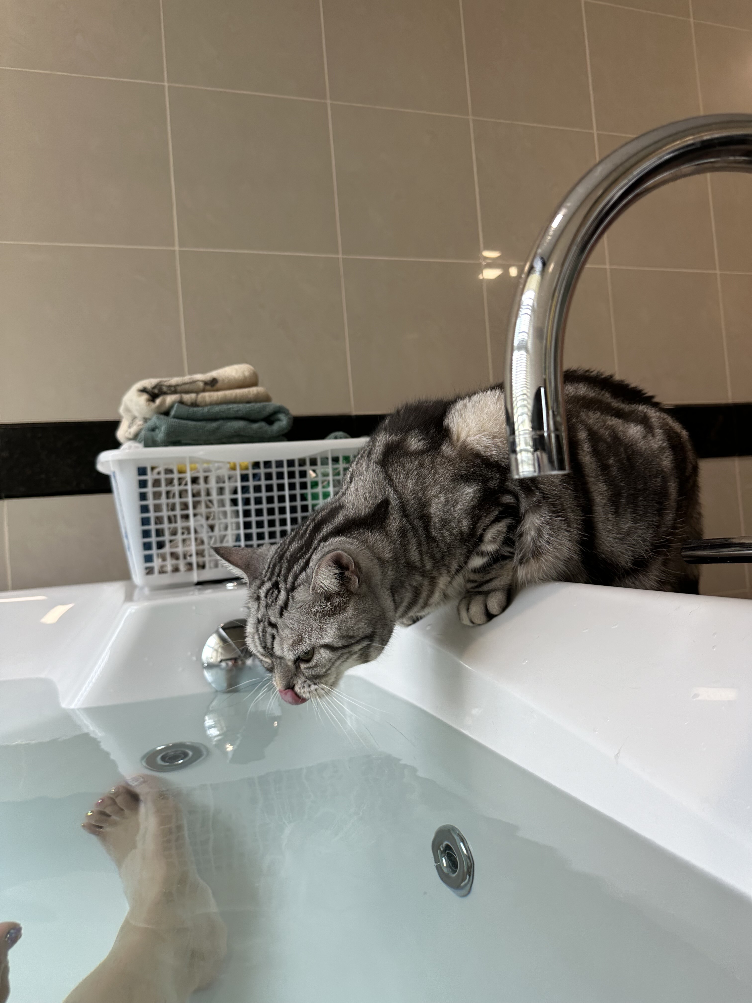 この数日はリビングから出てこなかったのに、お風呂にもお湯を飲みにやってきました。