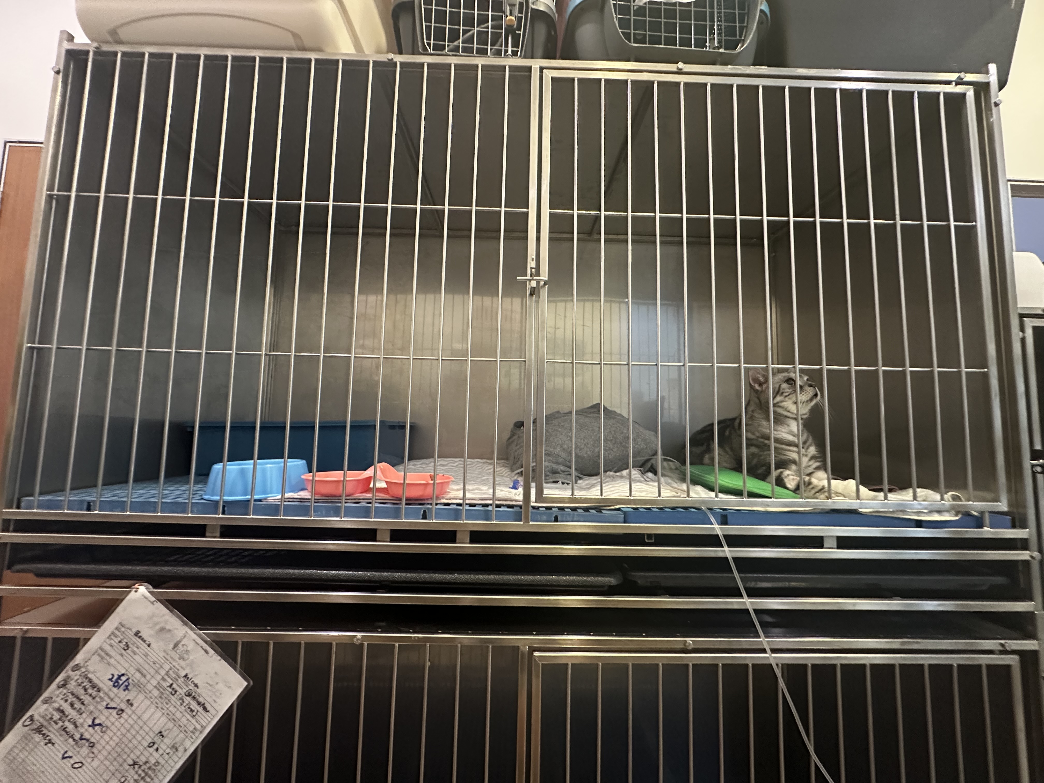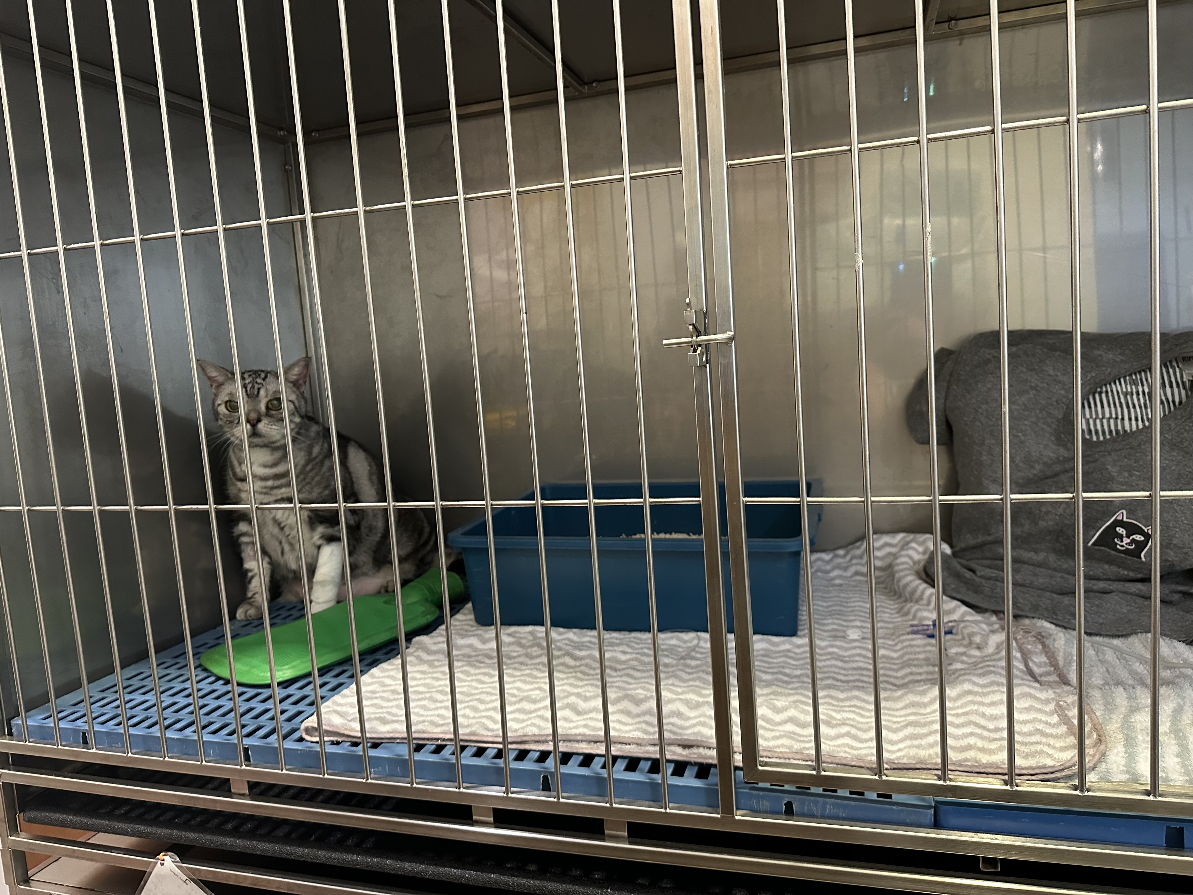 エアコンが効いた犬入院スペースの端っこの、広いケージにしてくれました。