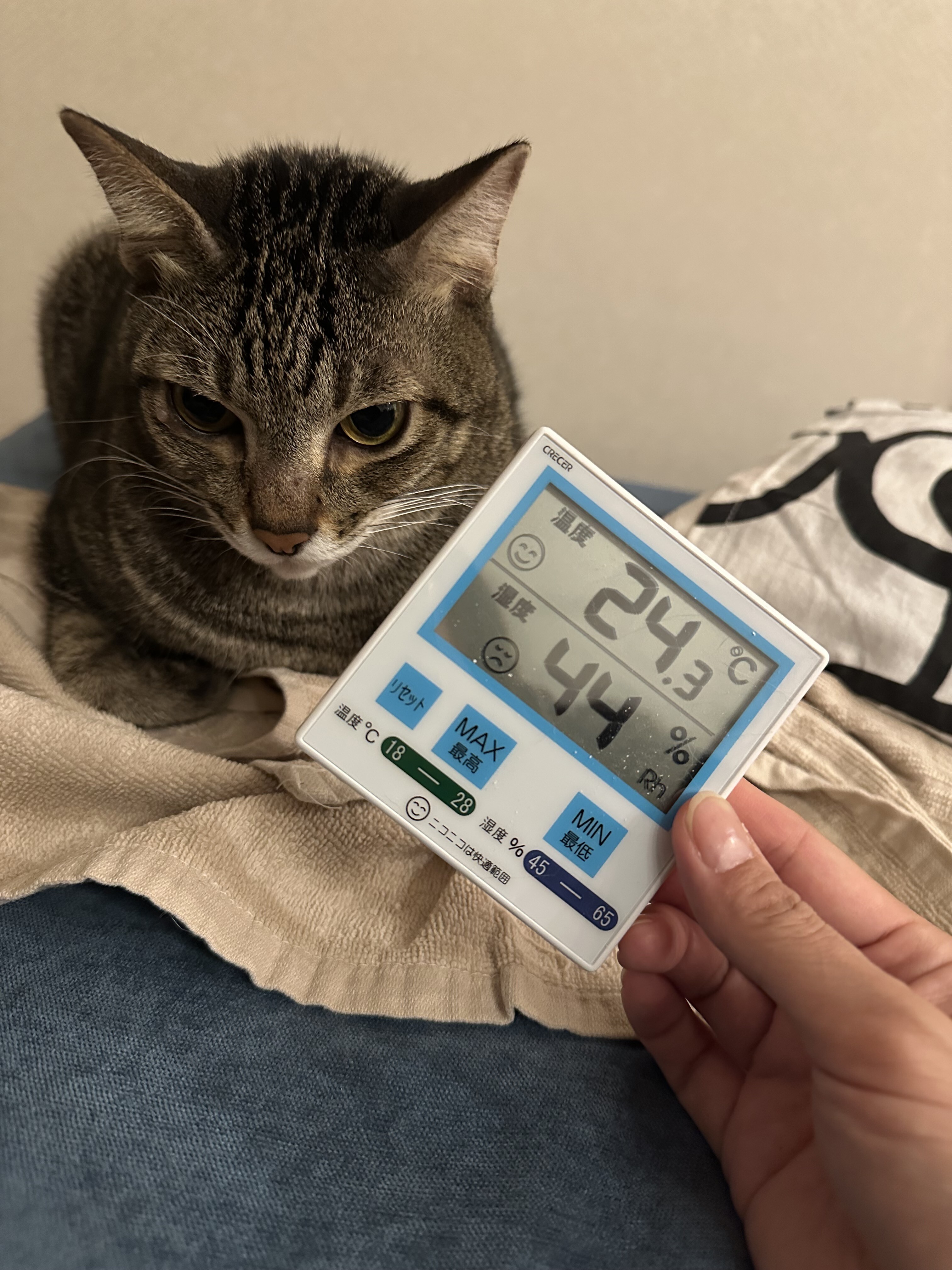 しばらくは猫たちの体調管理を最優先にして、長時間のお出かけは控えています。猫フリーの部屋に温湿度計置いて睨めっこしてる毎日です。