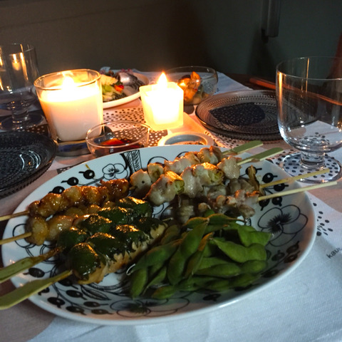 デパ地下で買った焼き鳥、残り物おかず、地ビール。